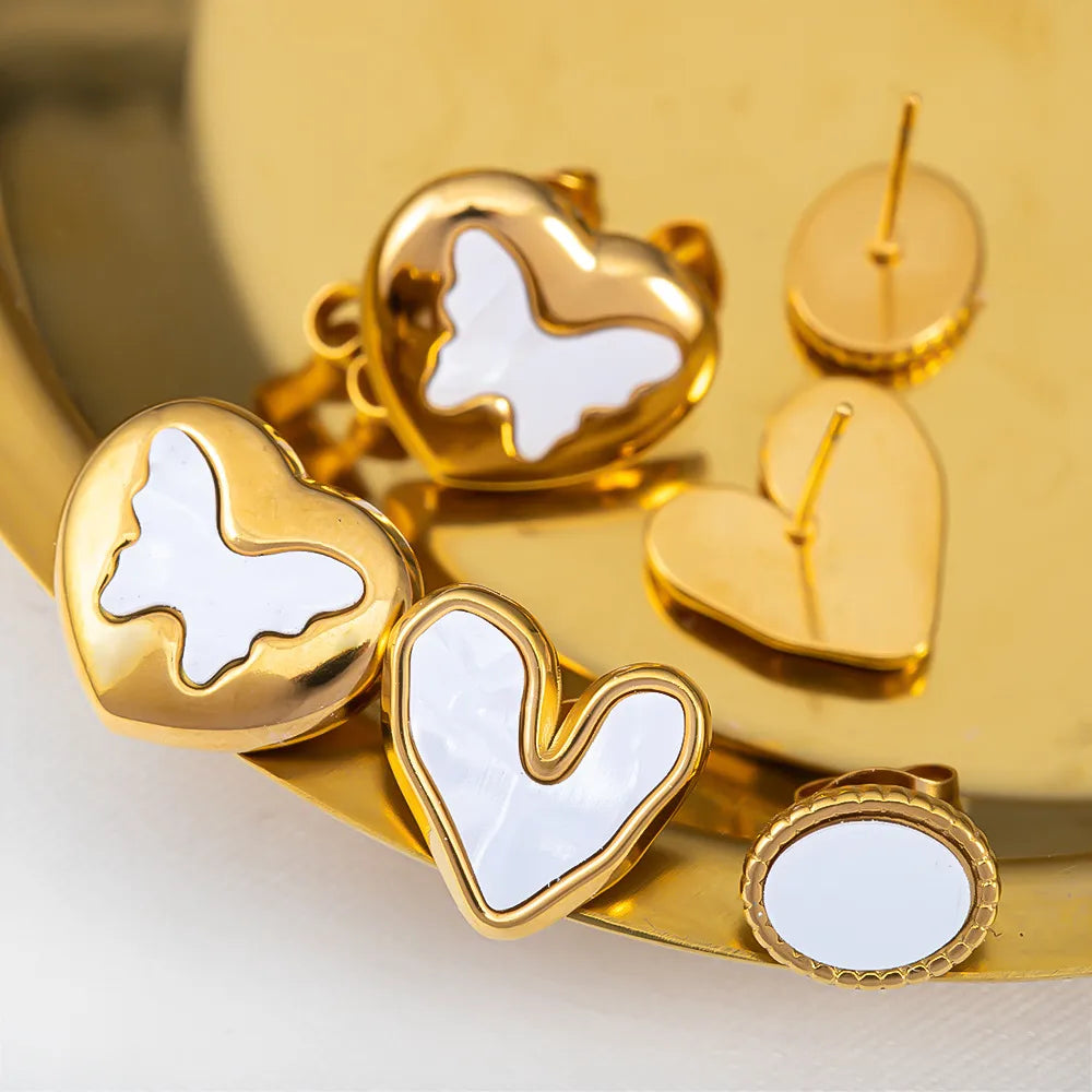 1 Pair Casual Simple Style Round Heart Shape Butterfly Inlay 304 Stainless Steel Shell Ear Studs
