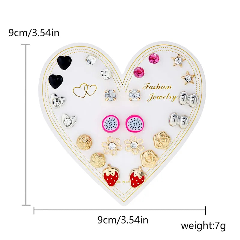 12 Pairs Casual Cute Heart Shape Strawberry Butterfly Inlay Alloy Artificial Rhinestones Ear Studs