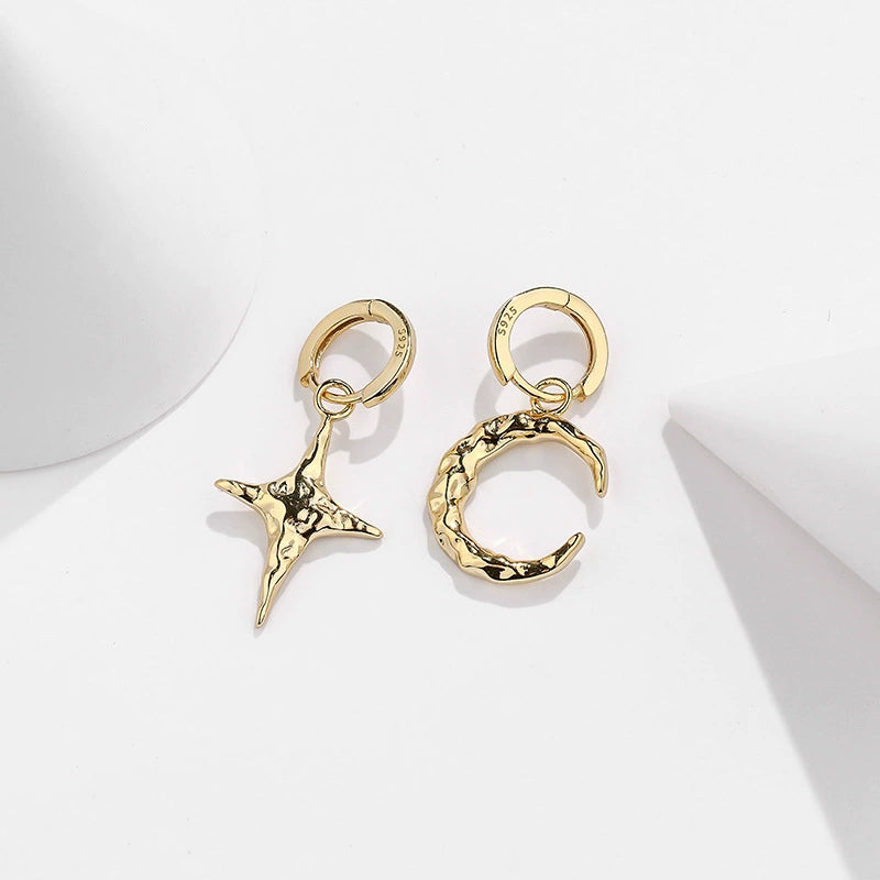 925 Sterling Silver Geometric Small Star Moon Asymmetric Women's Earrings