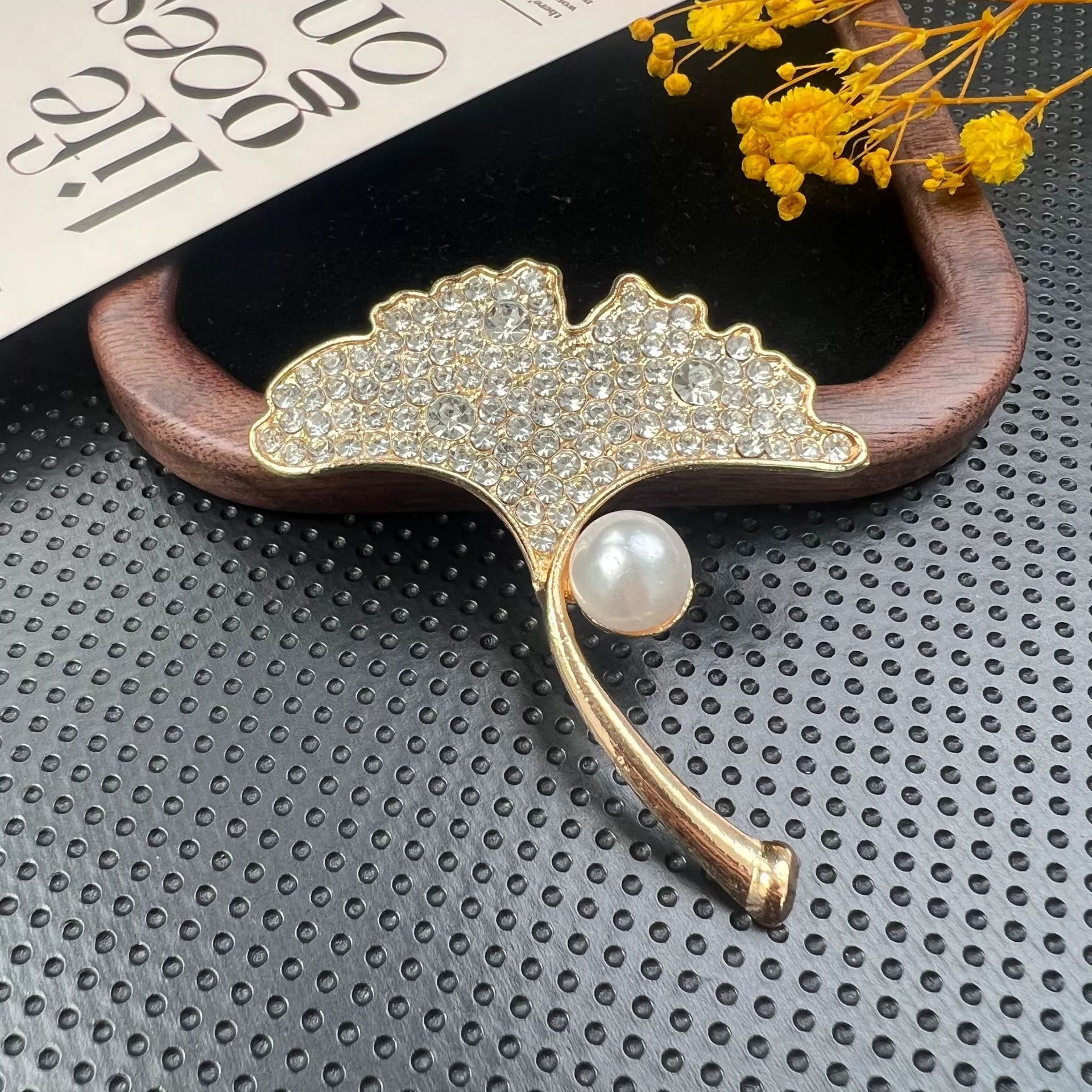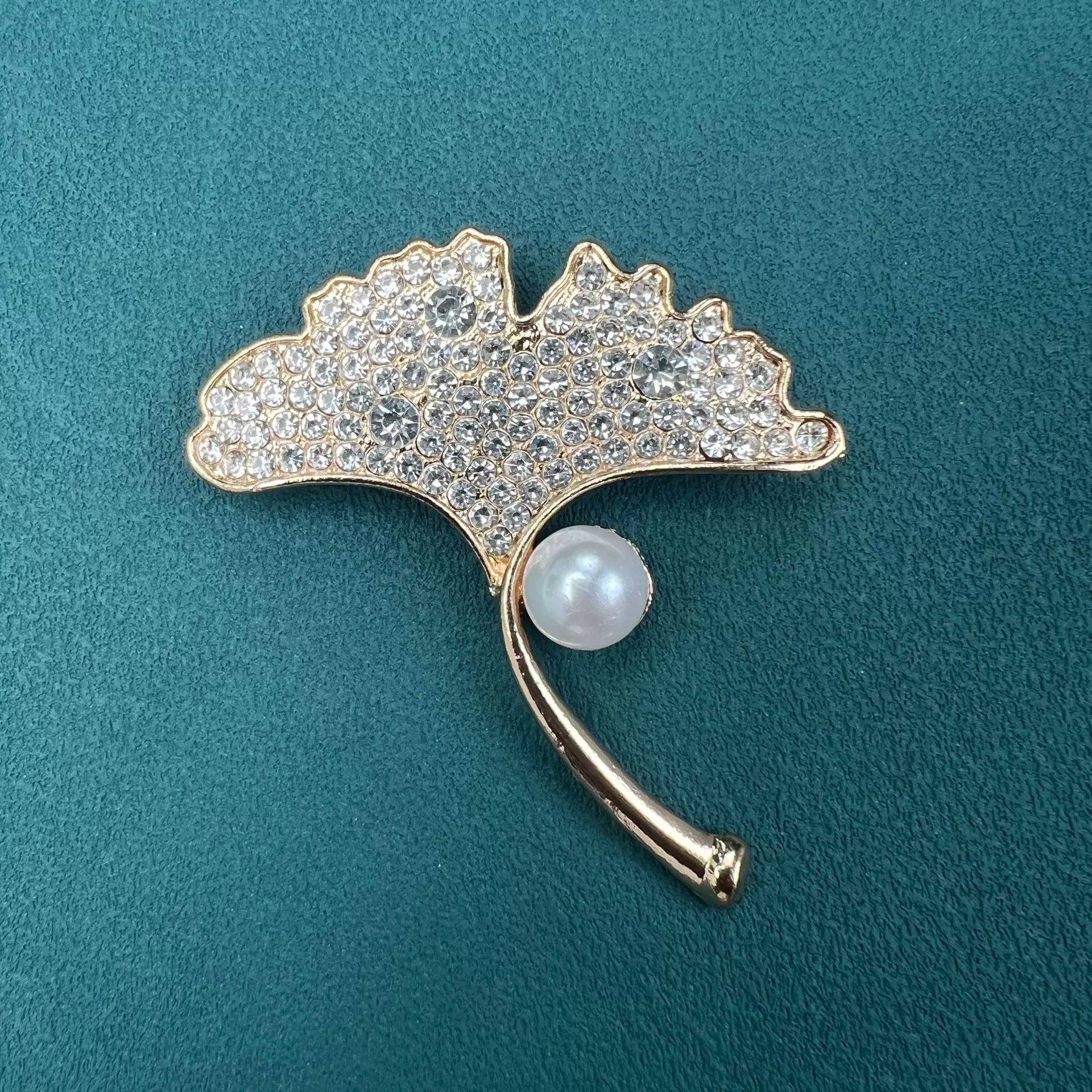 Alloy Pearl Ginkgo Leaf Rhinestone Brooch With Electroplating Treatment And Flower Pattern For Unisex