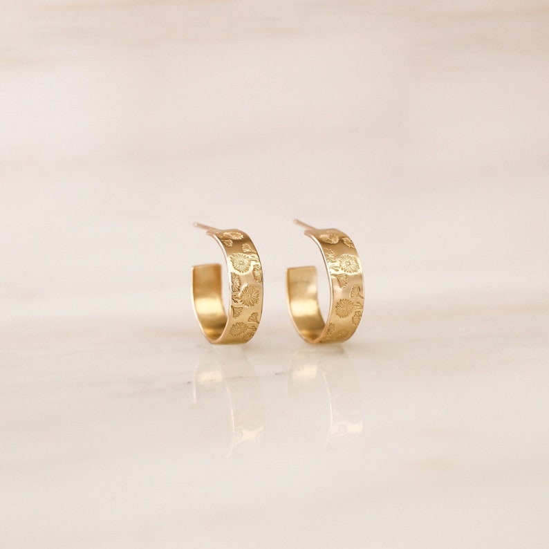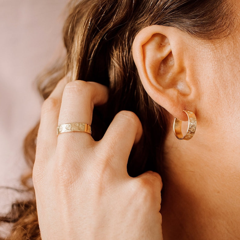- Each hoop is hand cut + hand stamped to order, making them perfectly unique to you!