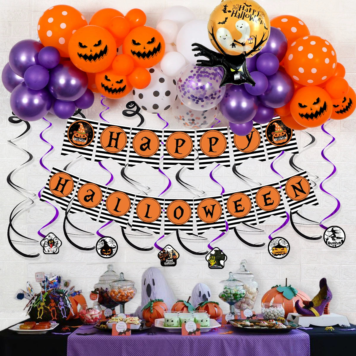 Halloween Round Latex Balloon Party Decoration With Rain Silk Curtain Arrangement And Print