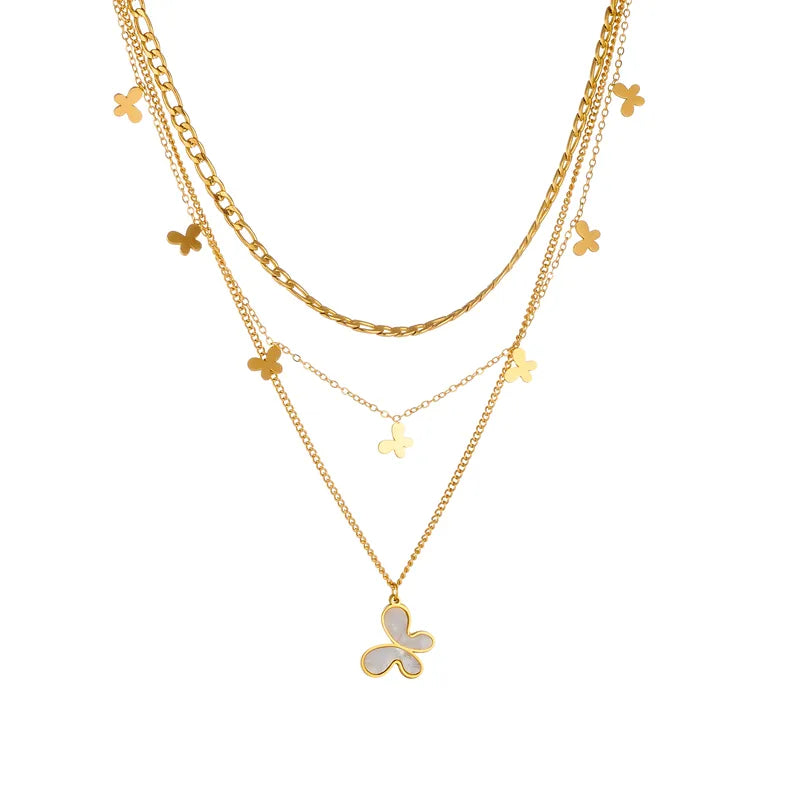 Wholesale Jewelry Vintage Style Sweet Butterfly 304 Stainless Steel Shell 18K Gold Plated Inlay Three Layer Necklace