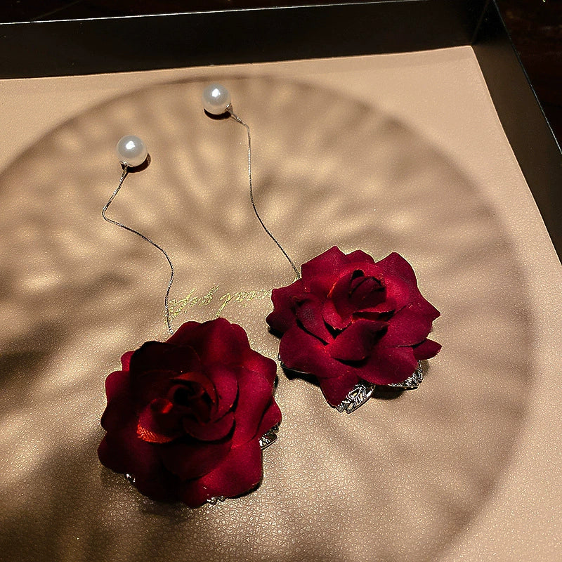 Wholesale Pearl Earrings With Silver Needle And Red Flower French Retro Style