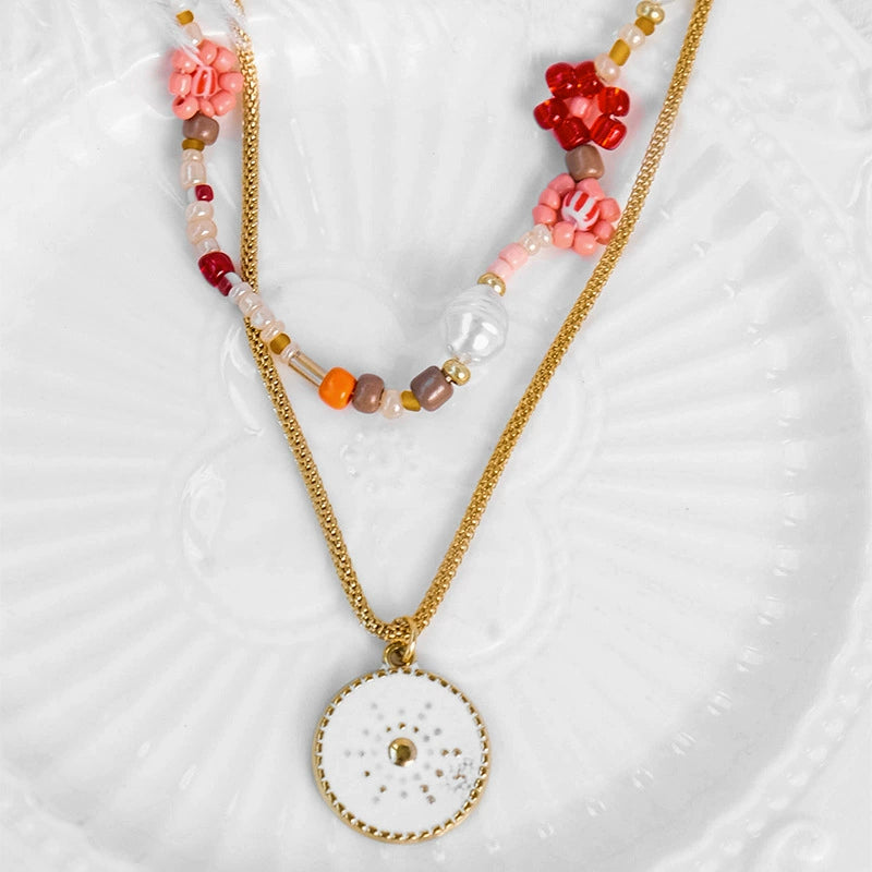 Wholesale Women's Fashion Geometric Stainless Steel And Pearl Beaded Sunflower Pendant Necklace With Electroplating Treatment