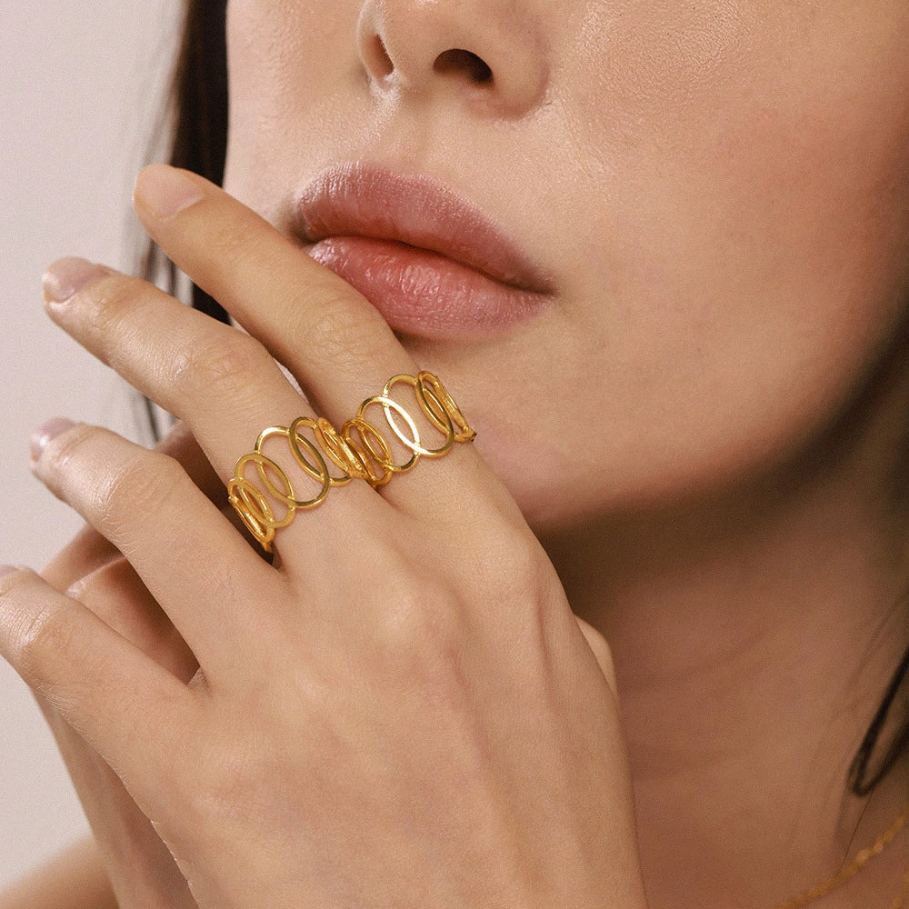 Wholesale Women's Light Luxury Geometric Ferris Wheel Interlocking Hollow Stainless Steel Goldplated Finger Ring