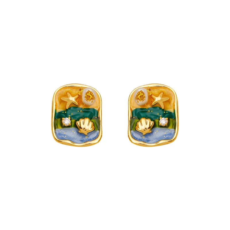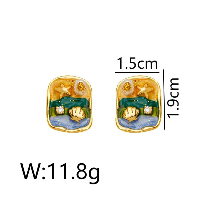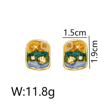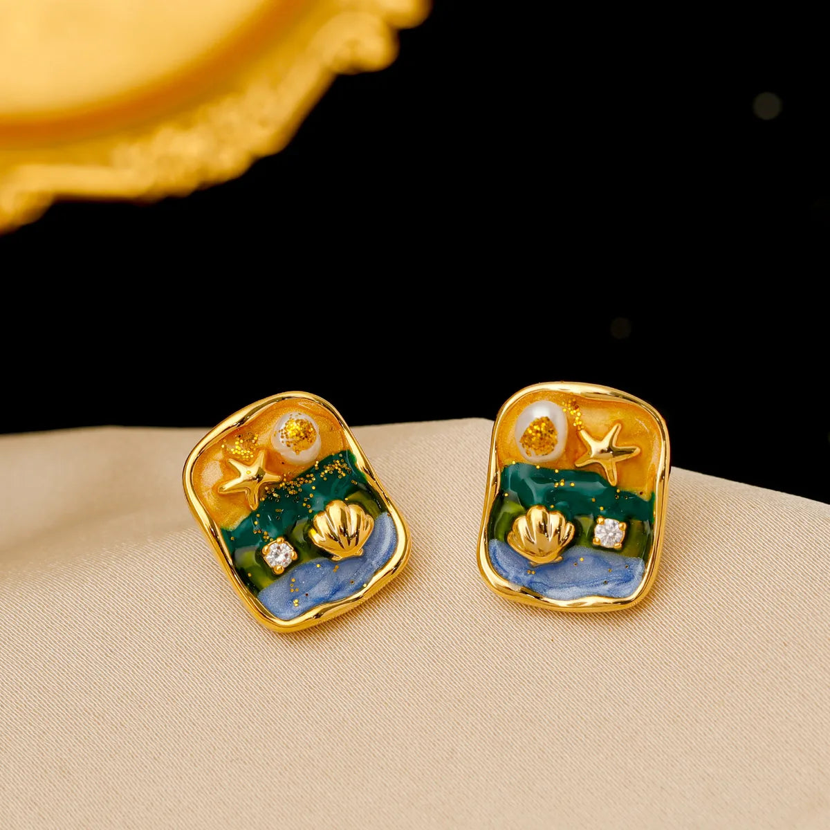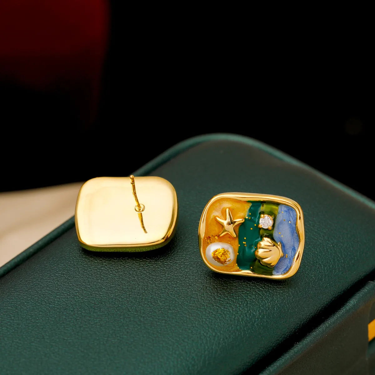 1 Pair Vacation Marine Style Beach Starfish Shell Epoxy Plating Inlay Copper Freshwater Pearl Copper Zircon 18K Gold Plated Ear Studs