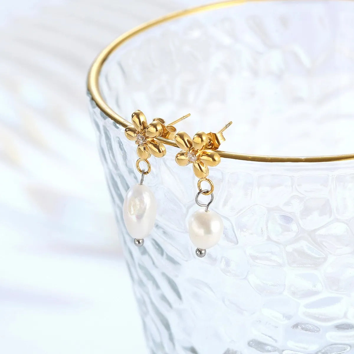 1 Piece Elegant C Shape Flower Bow Knot Inlay 304 Stainless Steel Rhinestones Pearl 18K Gold Plated Drop Earrings