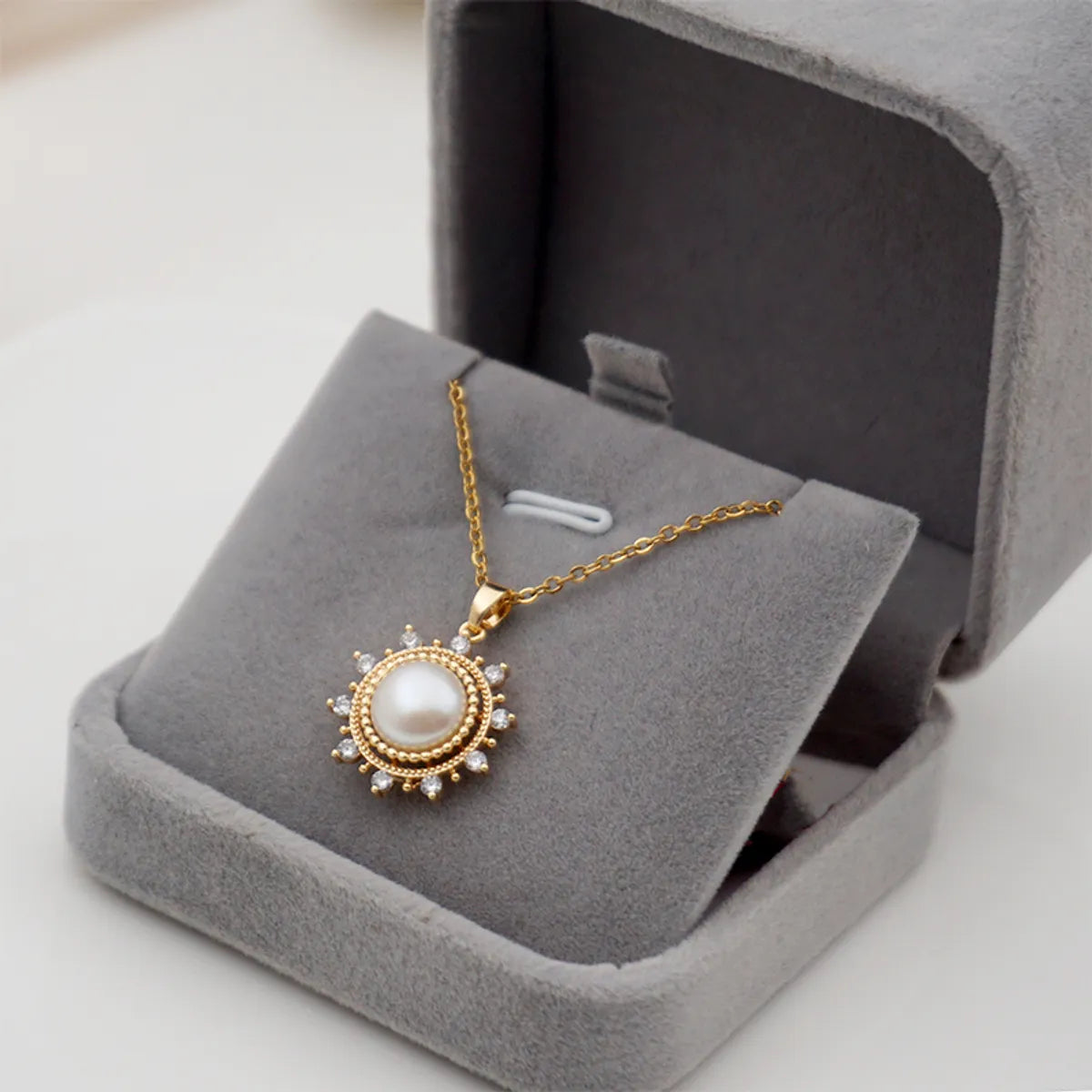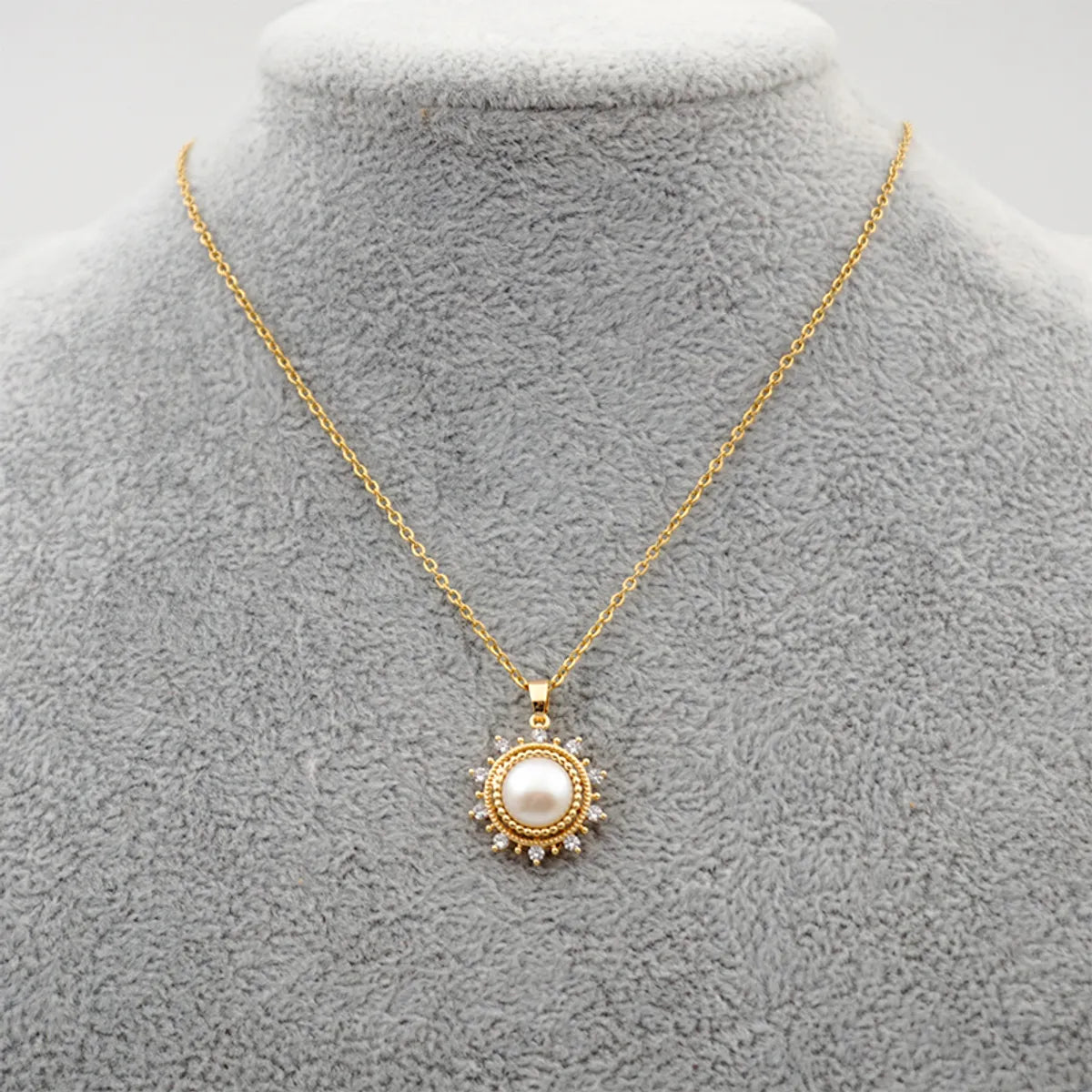 304 Stainless Steel Titanium Steel Copper Gold Plated Simple Style Handmade Inlay Sun Rhinestones Freshwater Pearl Pendant Necklace