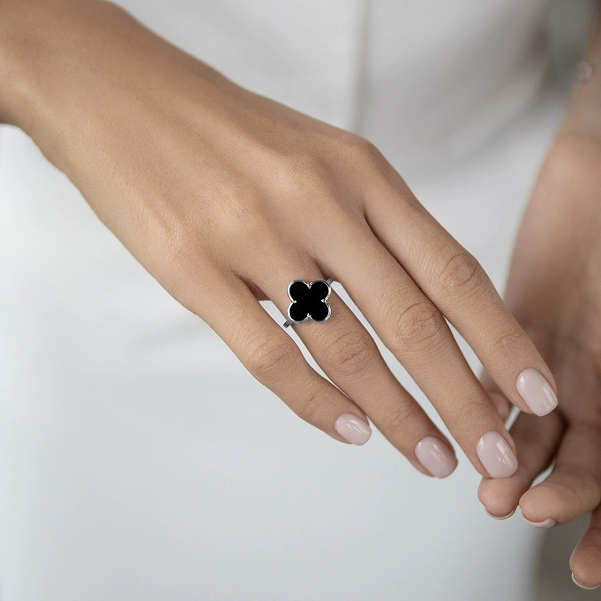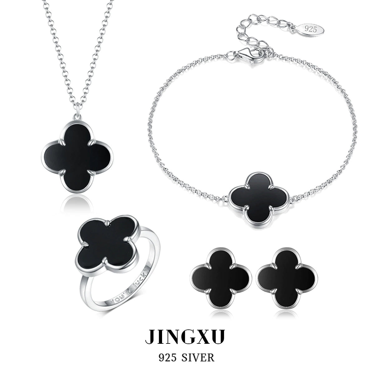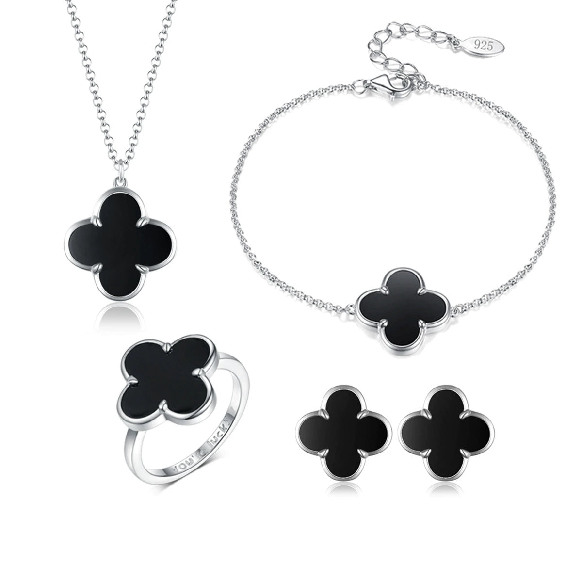 925 Sterling Silver Black Agate Fourleaf Clover Bracelet Earrings Necklace Set Seiko Plants Flowers Pattern Women's