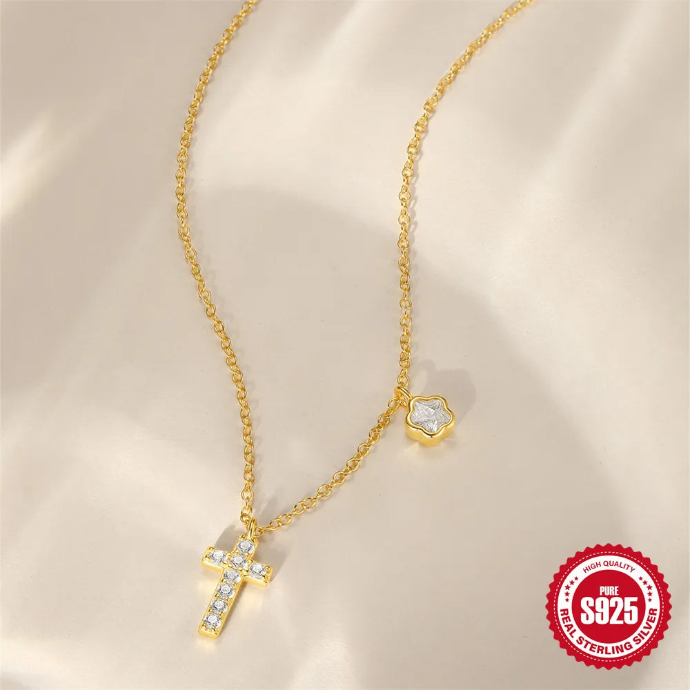 925 Sterling Silver Zircon Cable Chain Plating Cross Flower Multi Charms Necklace