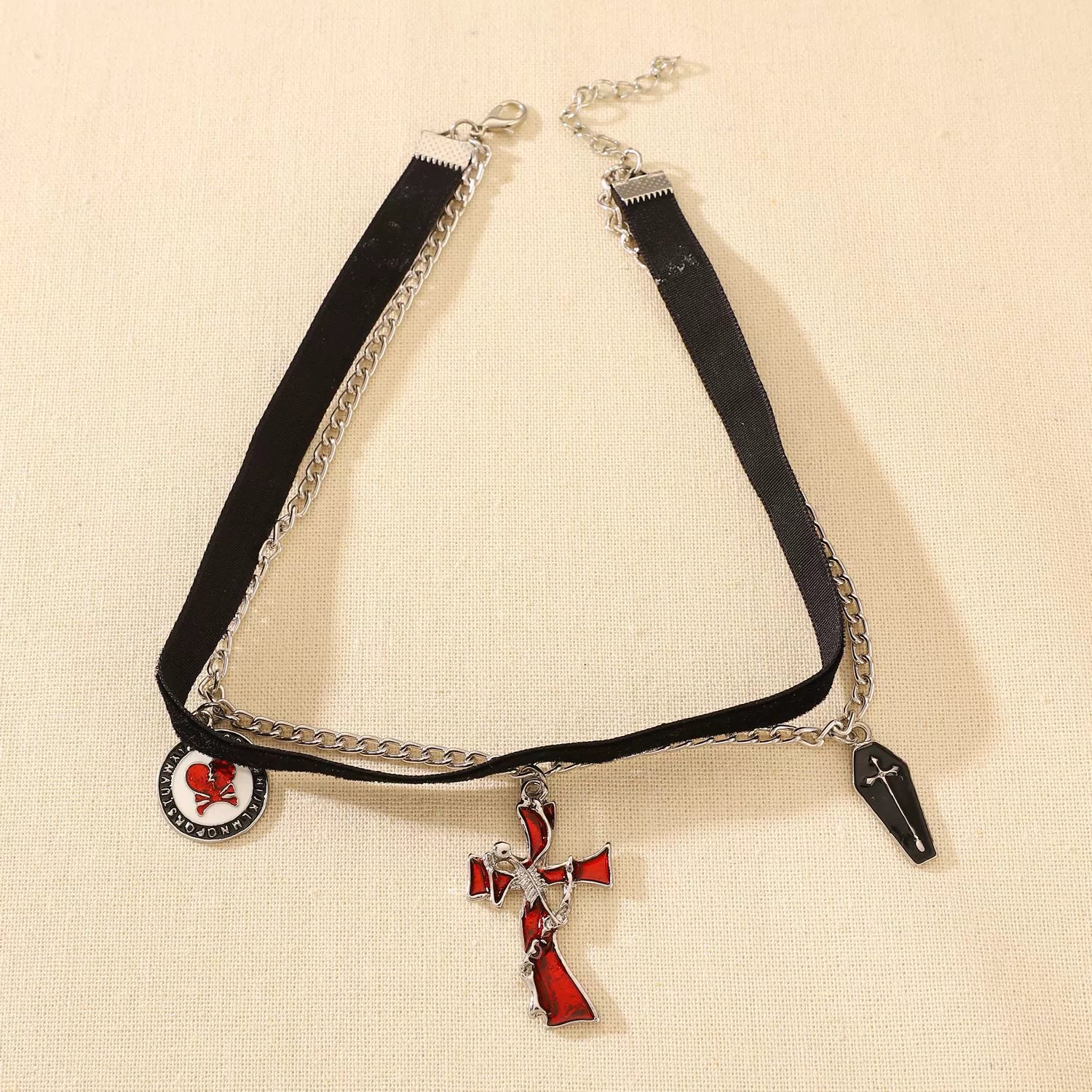 Alloy Gothic Skull Cross Pendant Double Layer Women's Necklace With Geometric Pattern And Electroplating