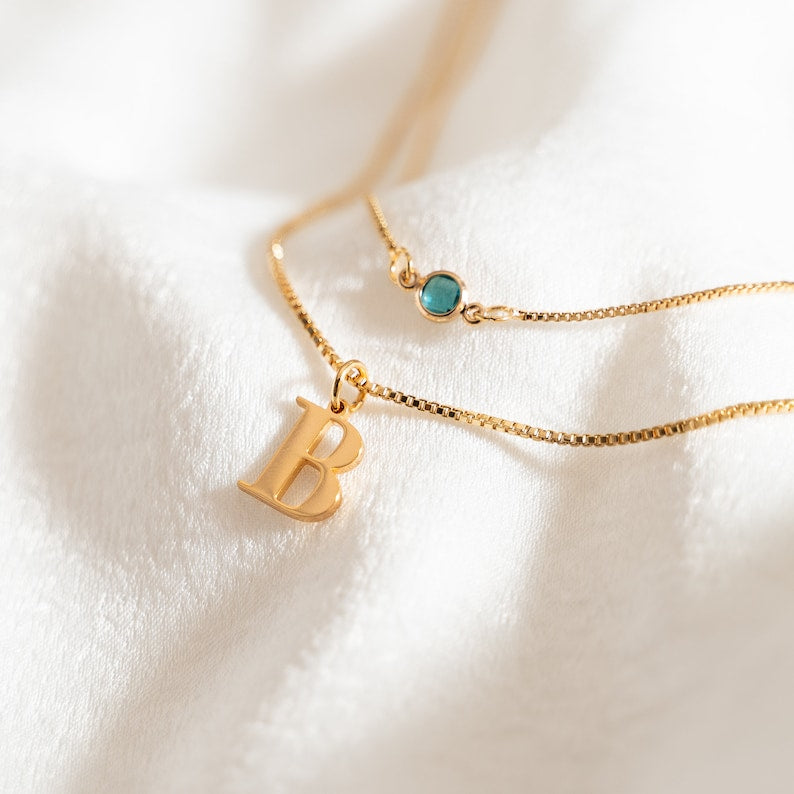 Custom Layered Birthstone Initial Necklace, Personalized Initial Necklace With Birthstone, Two Layered Birthstone Necklace, Christmas Gifts