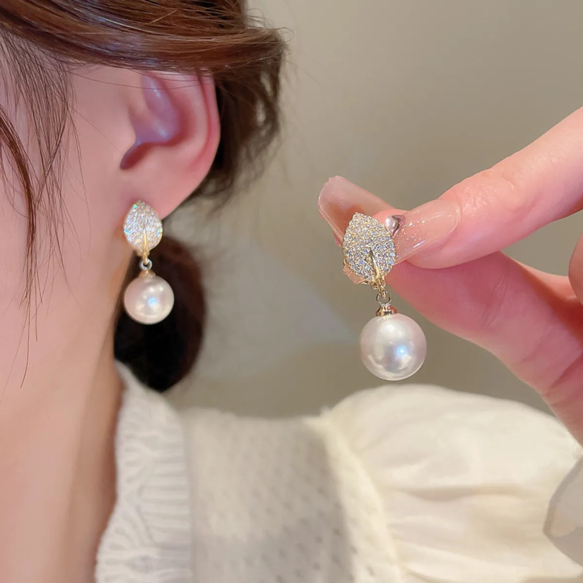 Elegant Leaves Copper Gold Plated Artificial Pearls Zircon Ear Studs 1 Pair