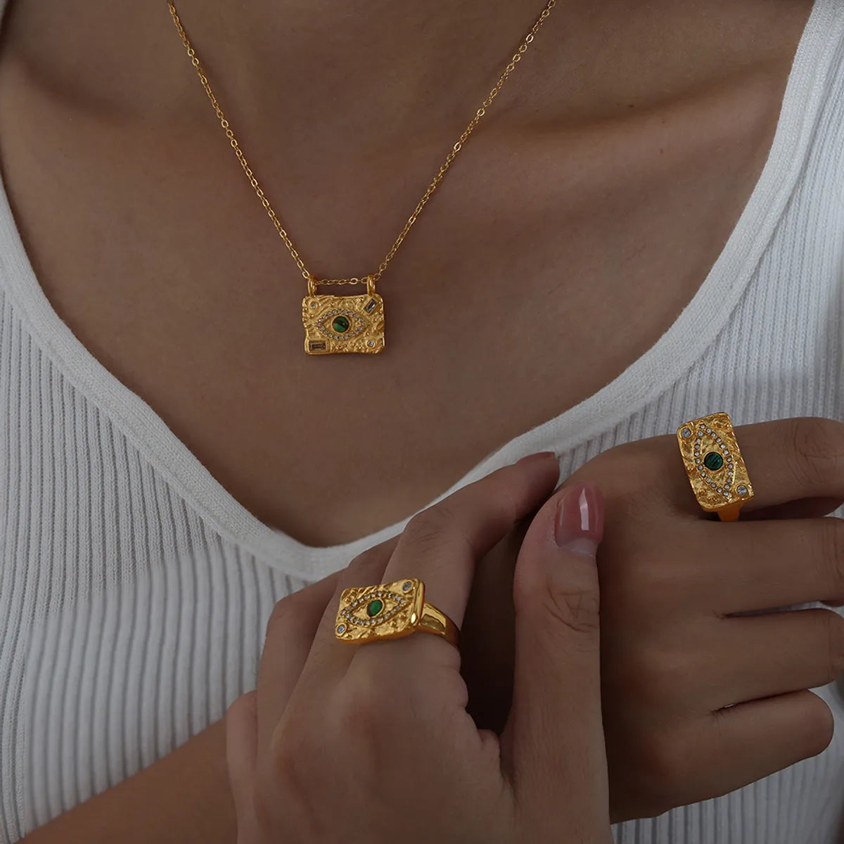 Elegant Luxurious Devil's Eye Square Titanium Steel Plating Inlay Turquoise Rhinestones Zircon 18k Gold Plated Rings Necklace