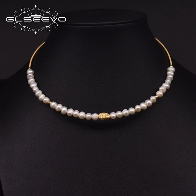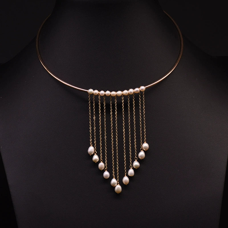 Freshwater Pearl Handmade Tassel Collar Retro Necklace 18K Gold Plated Geometric Design