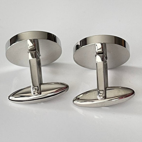 The cufflinks are composed of a stainless steel setting or silver setting which measure 3/4". The high res photo is sealed with jeweler's grade special resin over the print so it's water resistant and it has that amazing 3 dimensional affect.