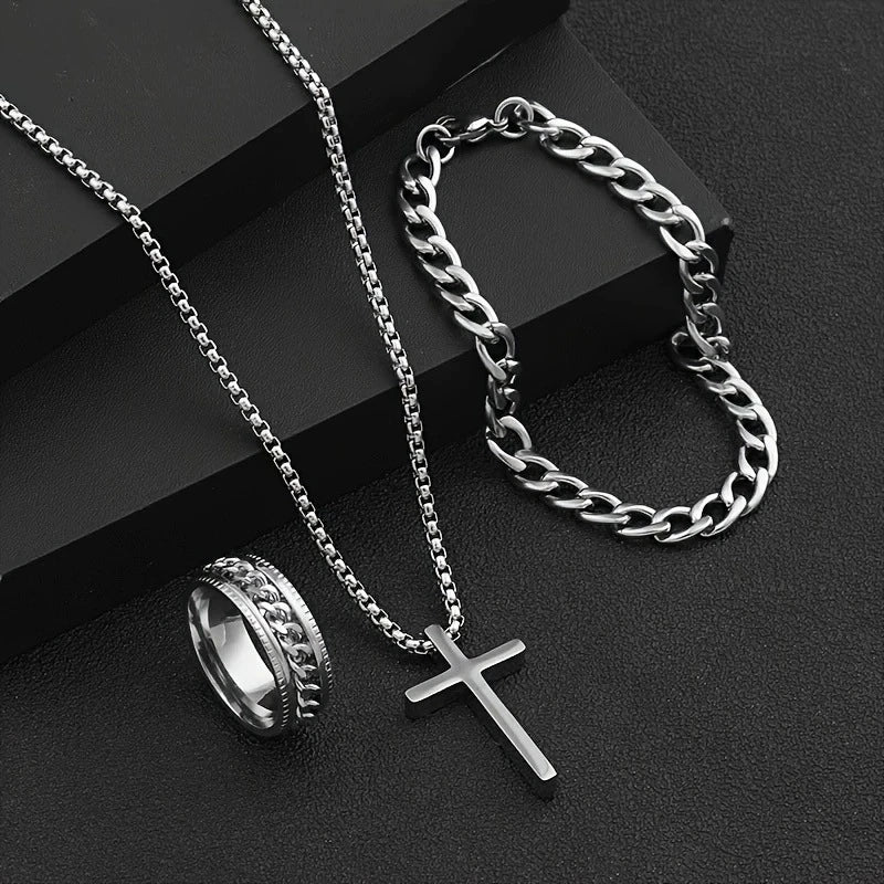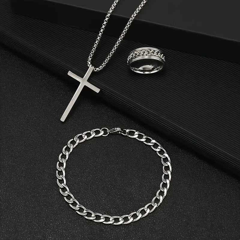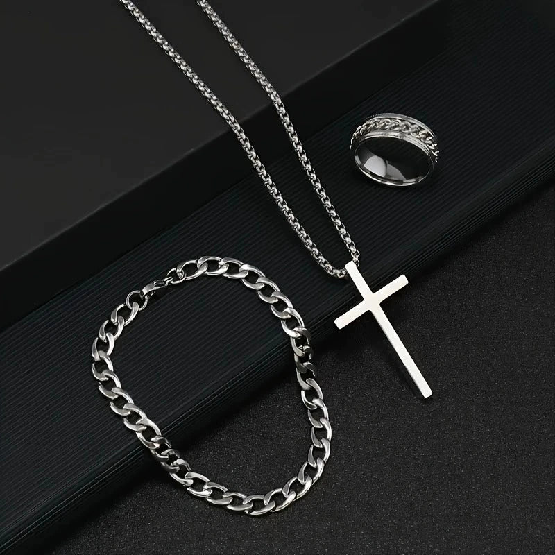 Stainless Steel Hiphop Trendy Cross Threepiece Jewelry Set