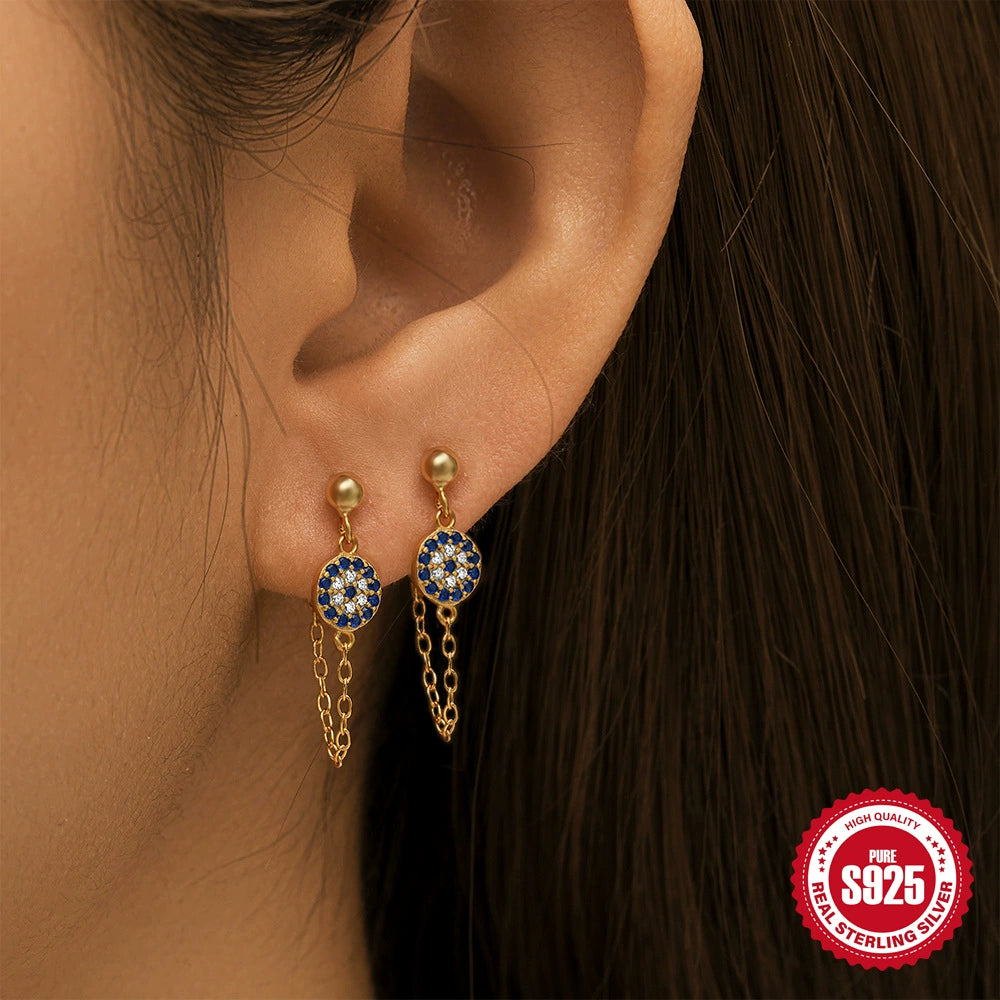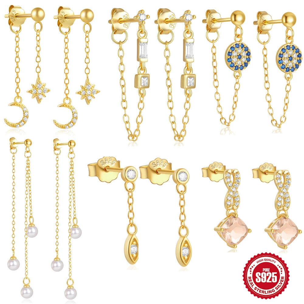 Sterling Silver Geometric Star Moon Tassel Chain Earrings With Electroplating