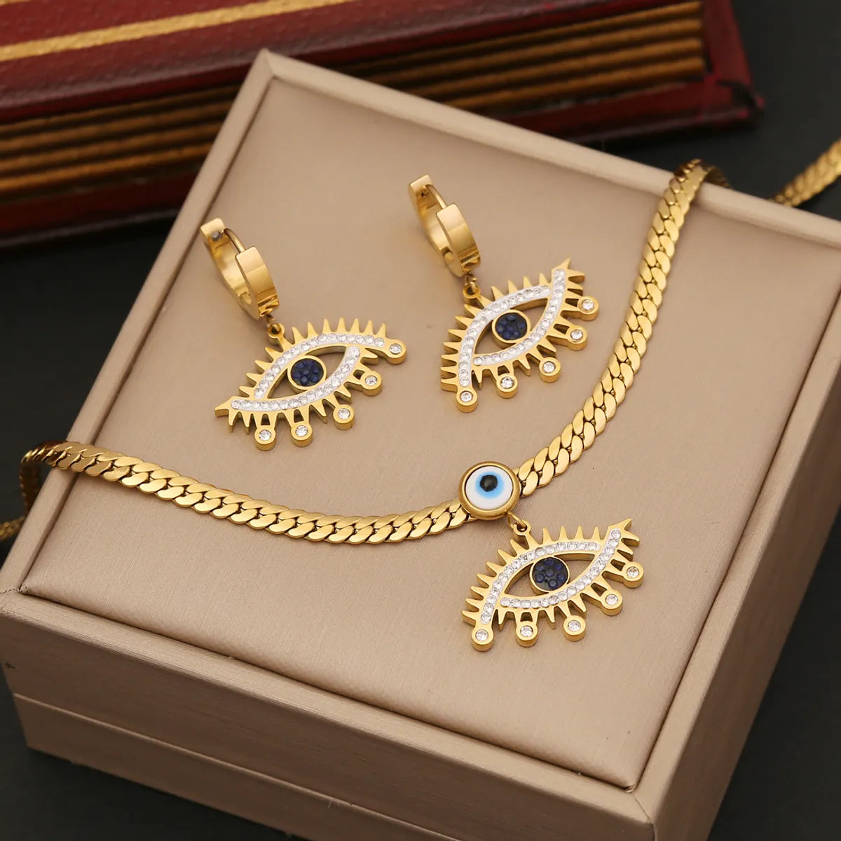 Wholesale Fashion Eye Stainless Steel Inlay 14k Gold Plated Zircon Bracelets Earrings Necklace
