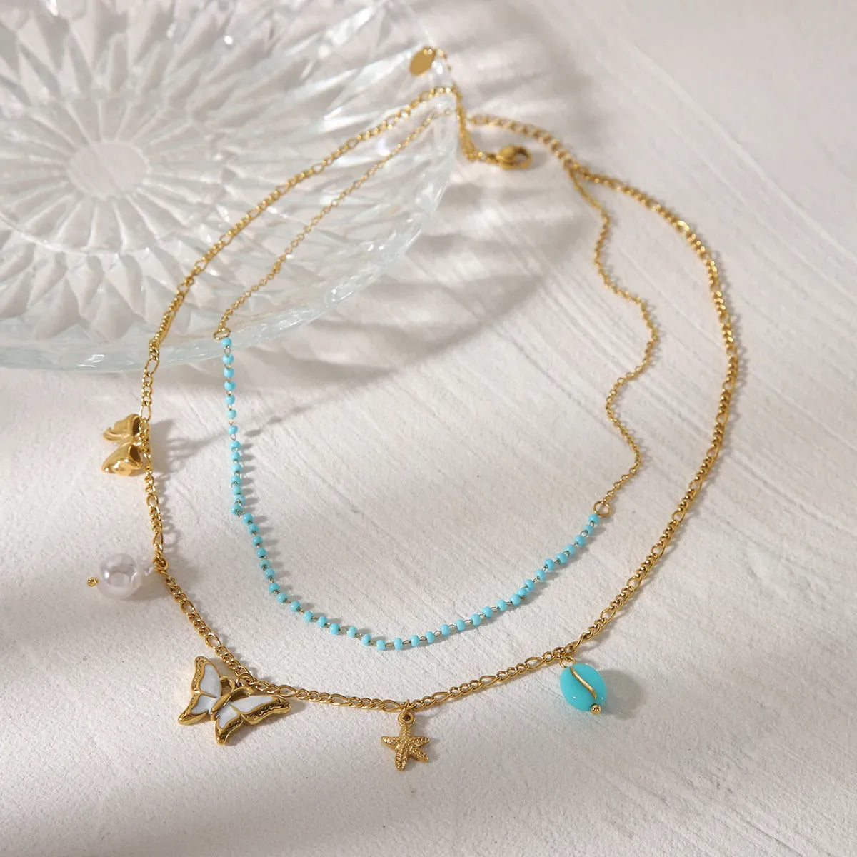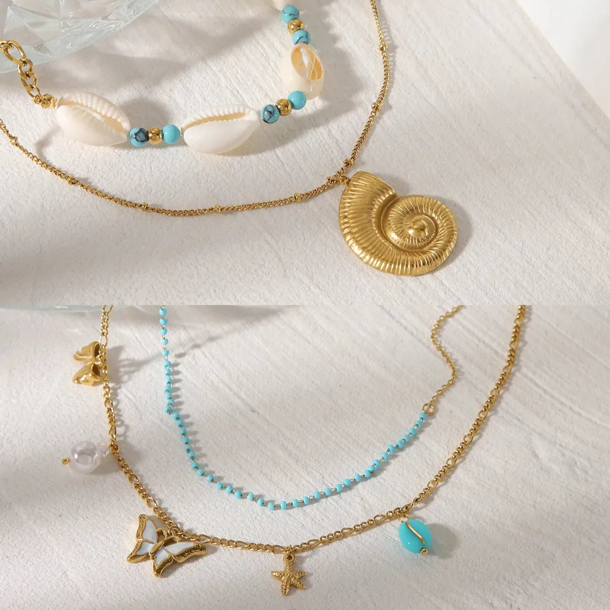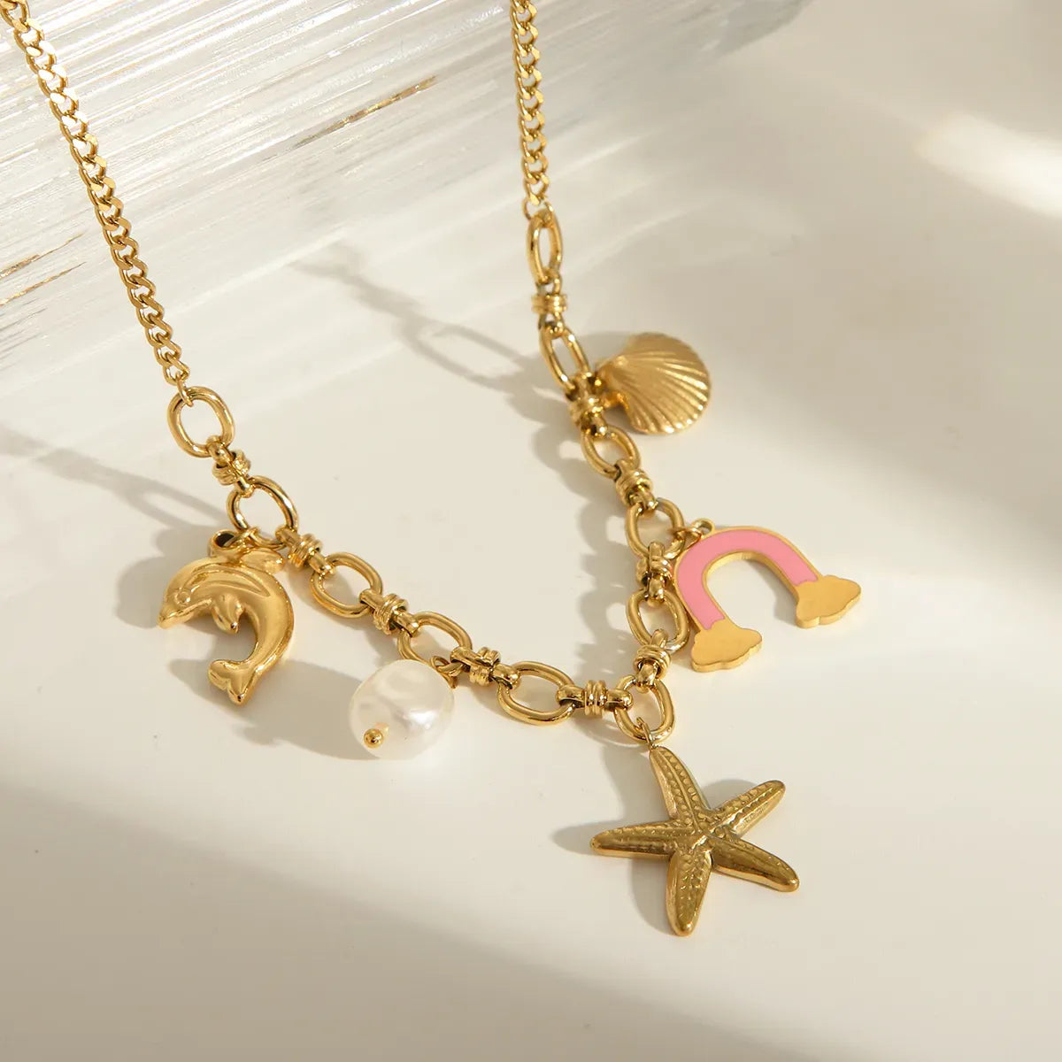 Wholesale Jewelry Beach Sweet Starfish Butterfly Shell 304 Stainless Steel Imitation Pearl Natural Stone 18K Gold Plated Enamel Multi Charms Necklace Cuban Link Chain Curb Chain Cable Chain