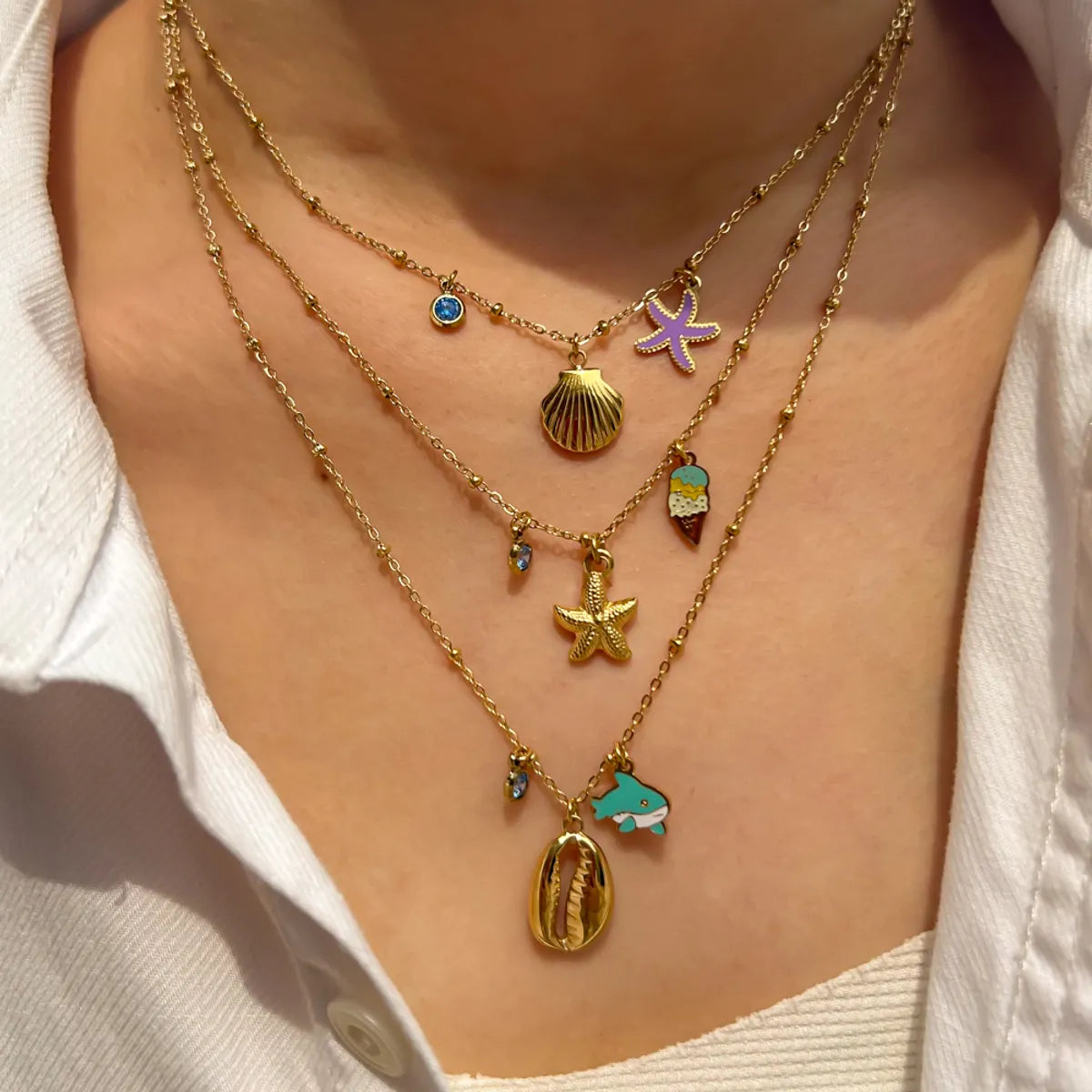 Wholesale Jewelry Marine Style Beach Tropical Starfish Dolphin Shell 304 Stainless Steel Rhinestones Shell 14K Gold Plated Enamel Plating Inlay Pendant Necklace