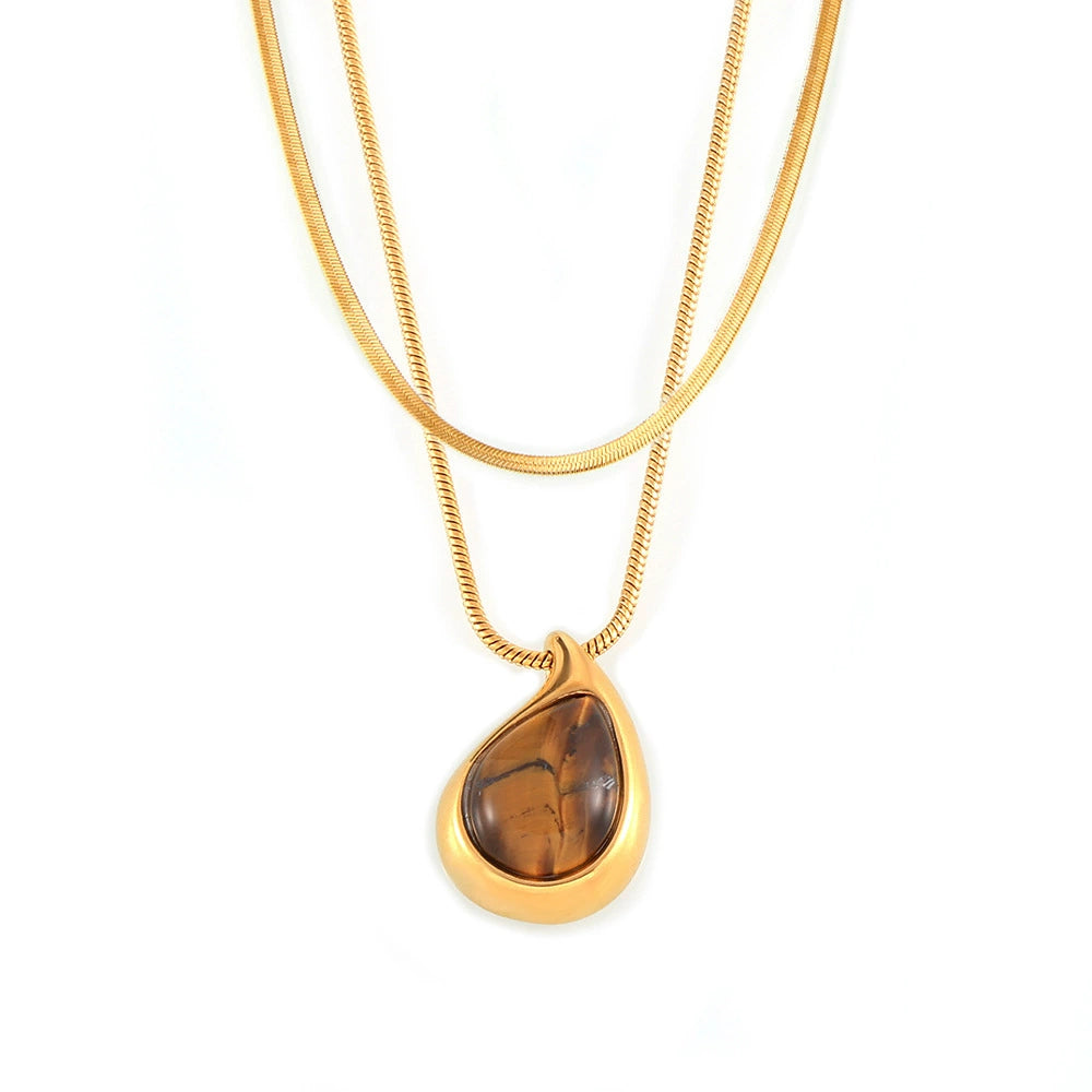 Wholesale Women's Geometric Dropshaped Tiger Eye Pendant Titanium Steel Goldplated Necklace