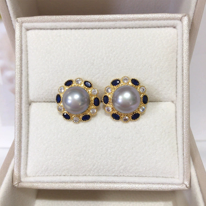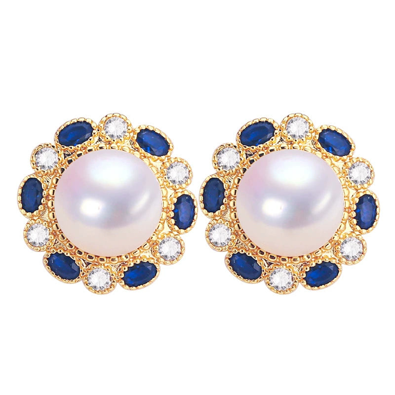 Women's Natural Freshwater Pearl Earrings Microinlaid Zircon Retro Elegant Flat Round Shape