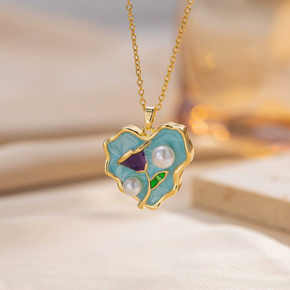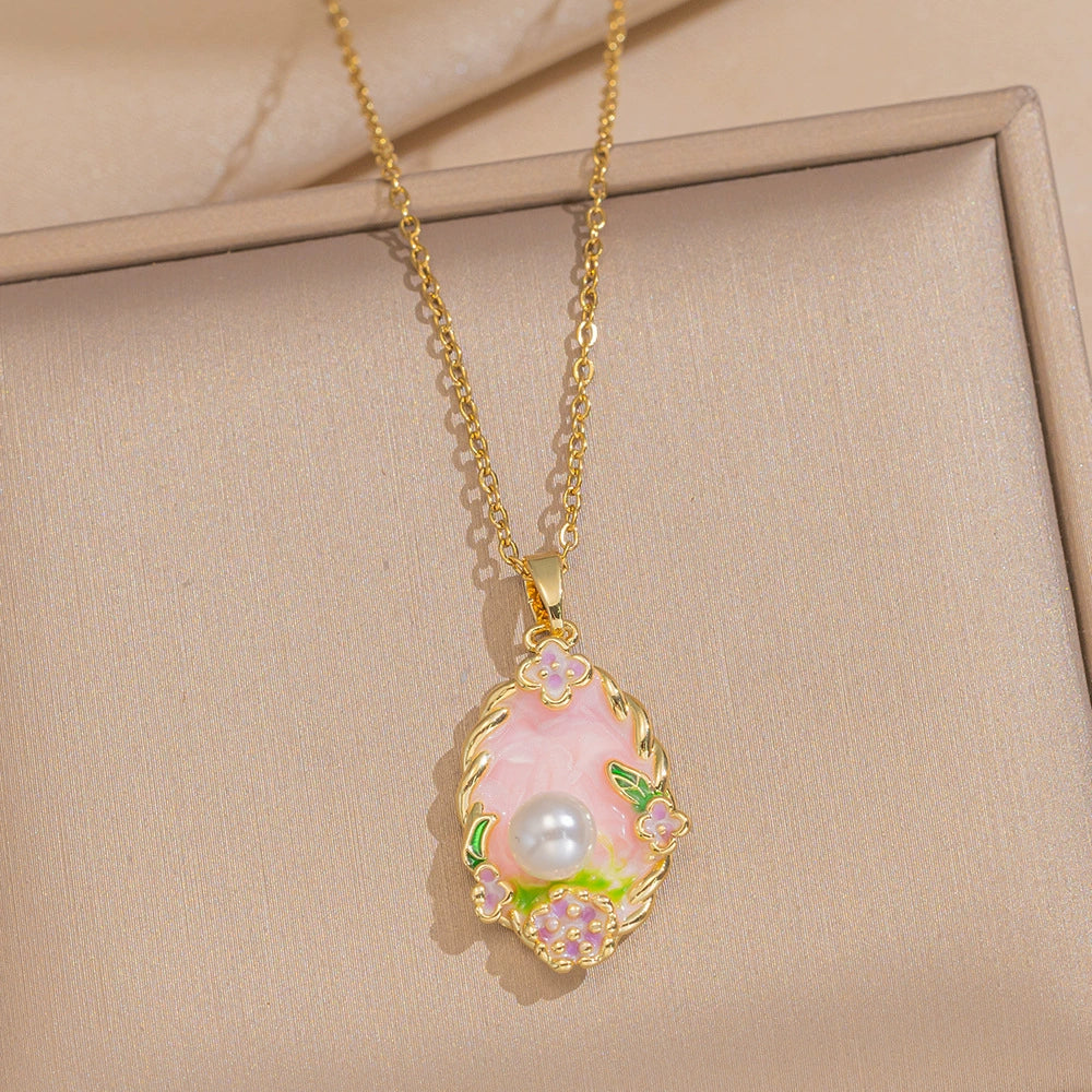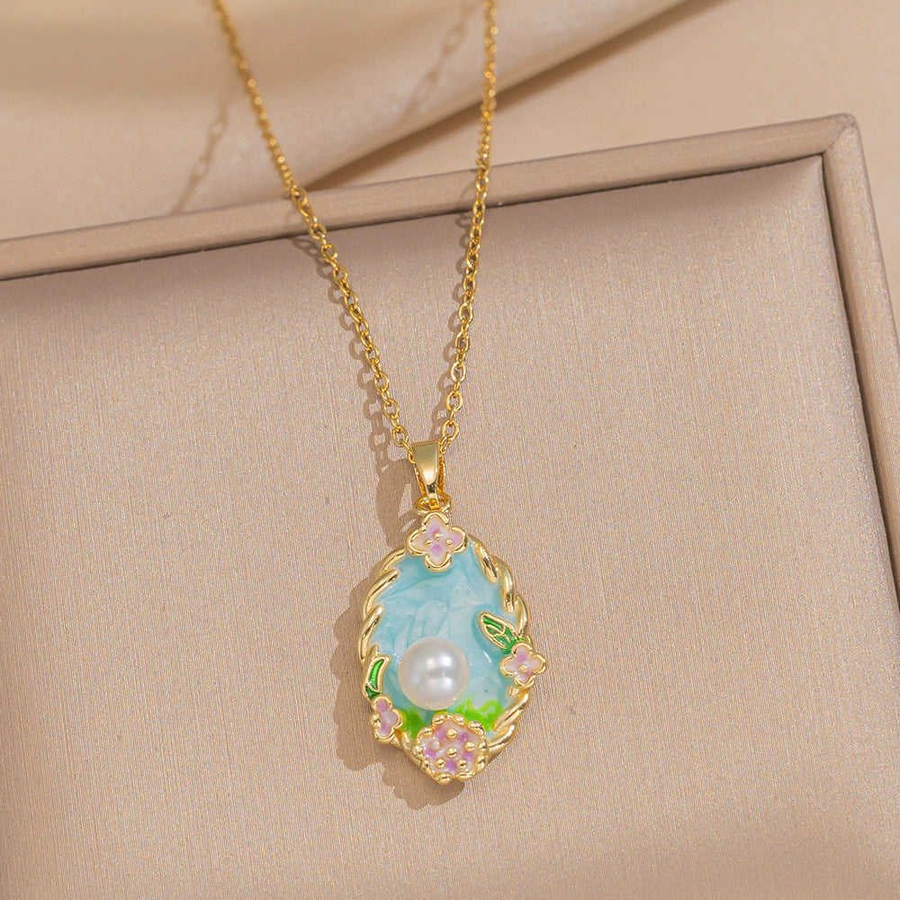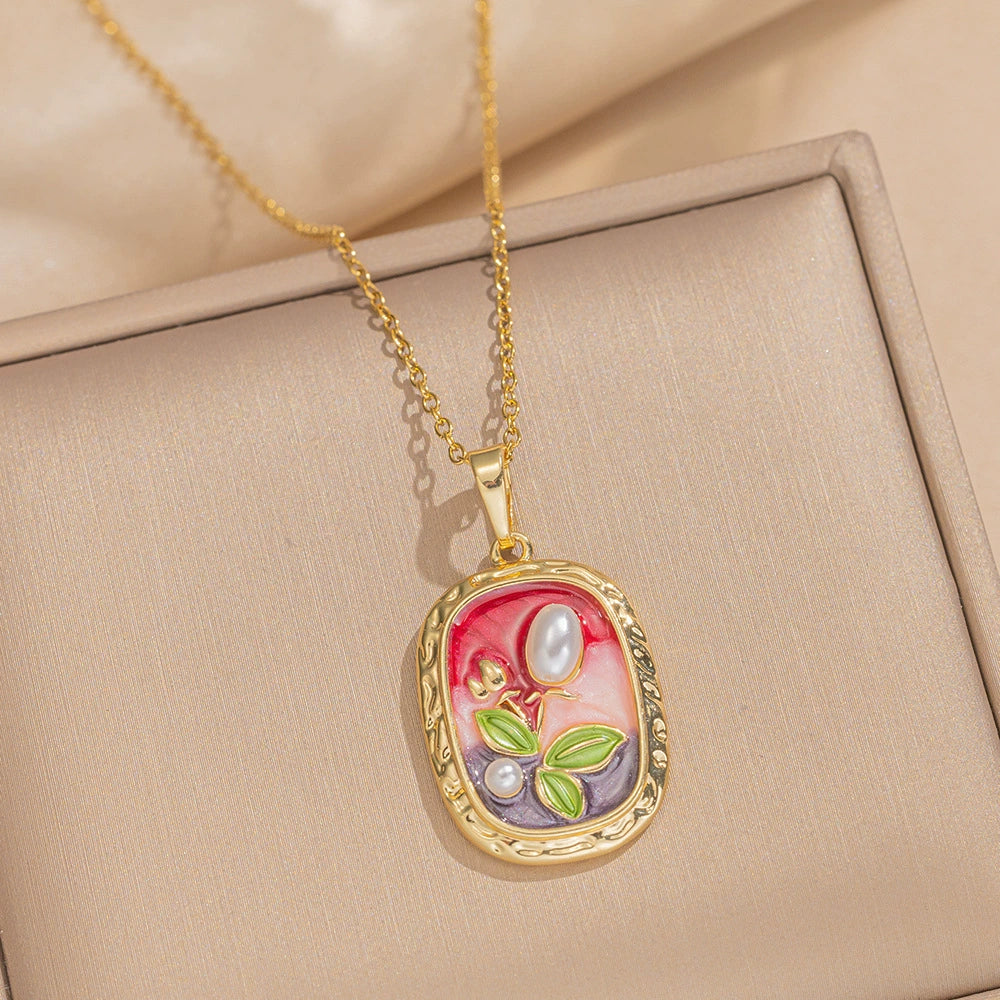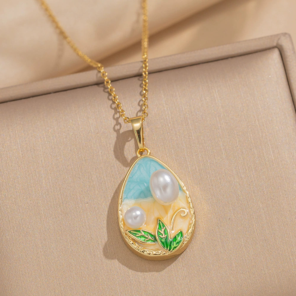Women's Oil Painting Style Leaf Shaped Necklace Copper Titanium Steel Baroque Elegant Niche Light Luxury French Retro Allmatch Electroplated In Vacuum Furnace