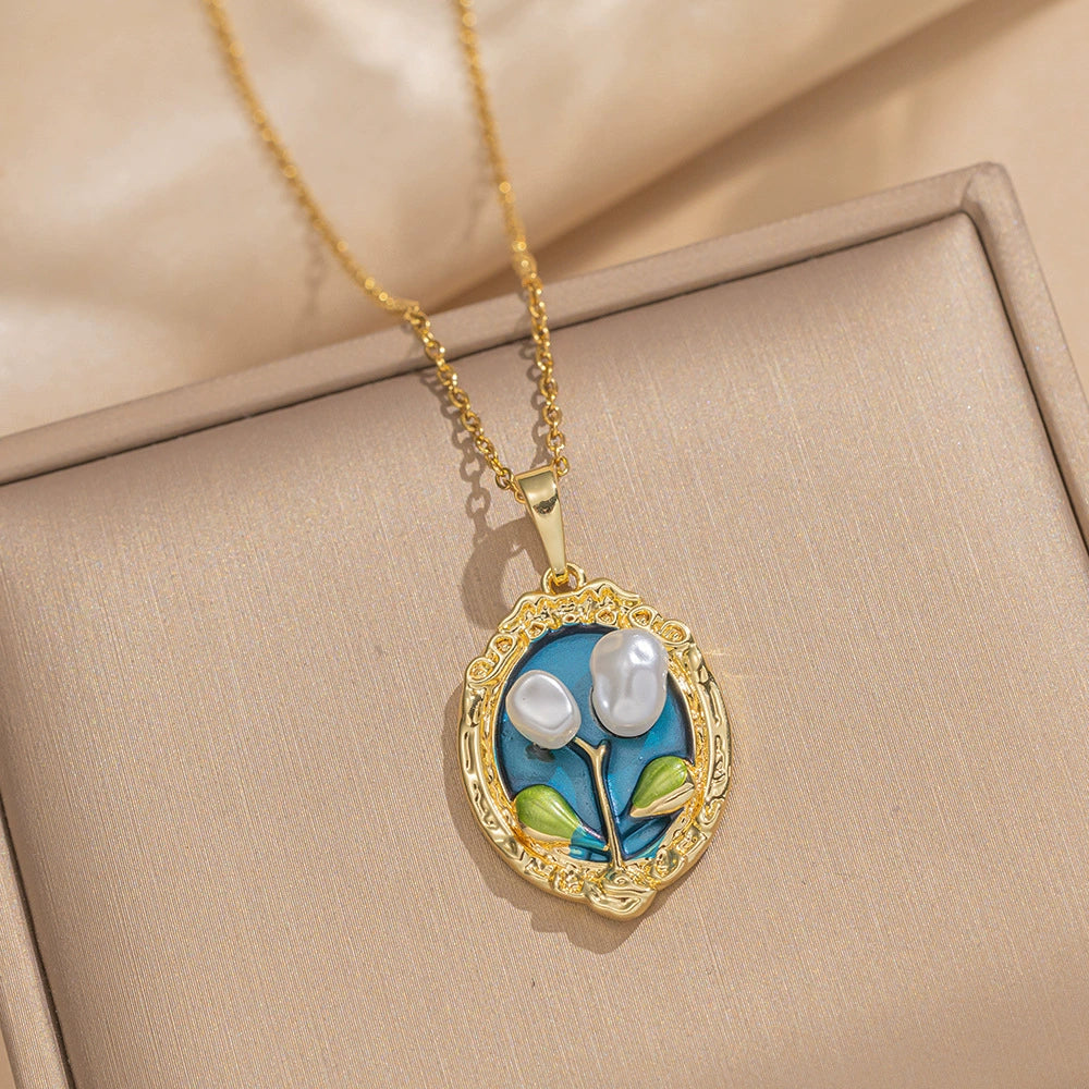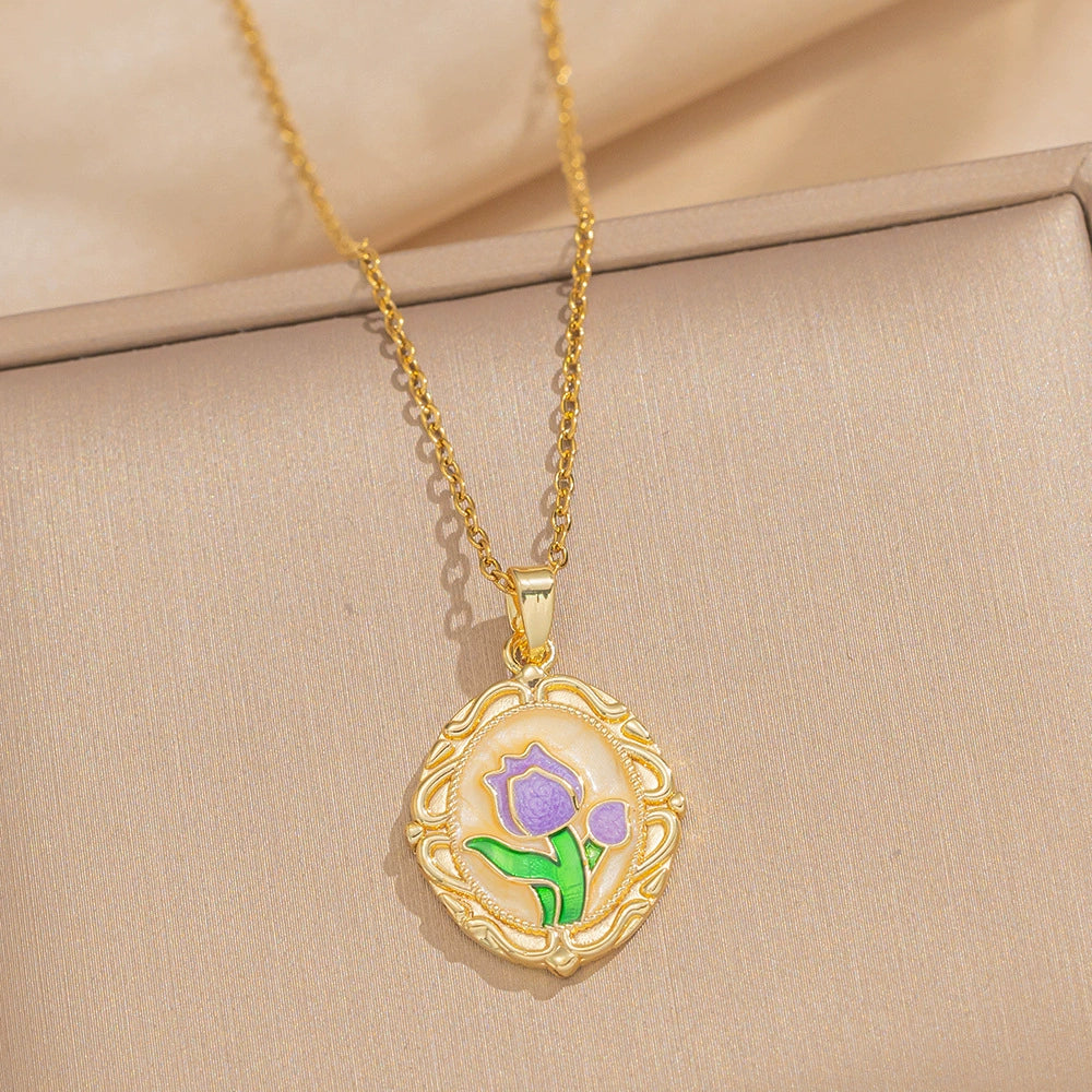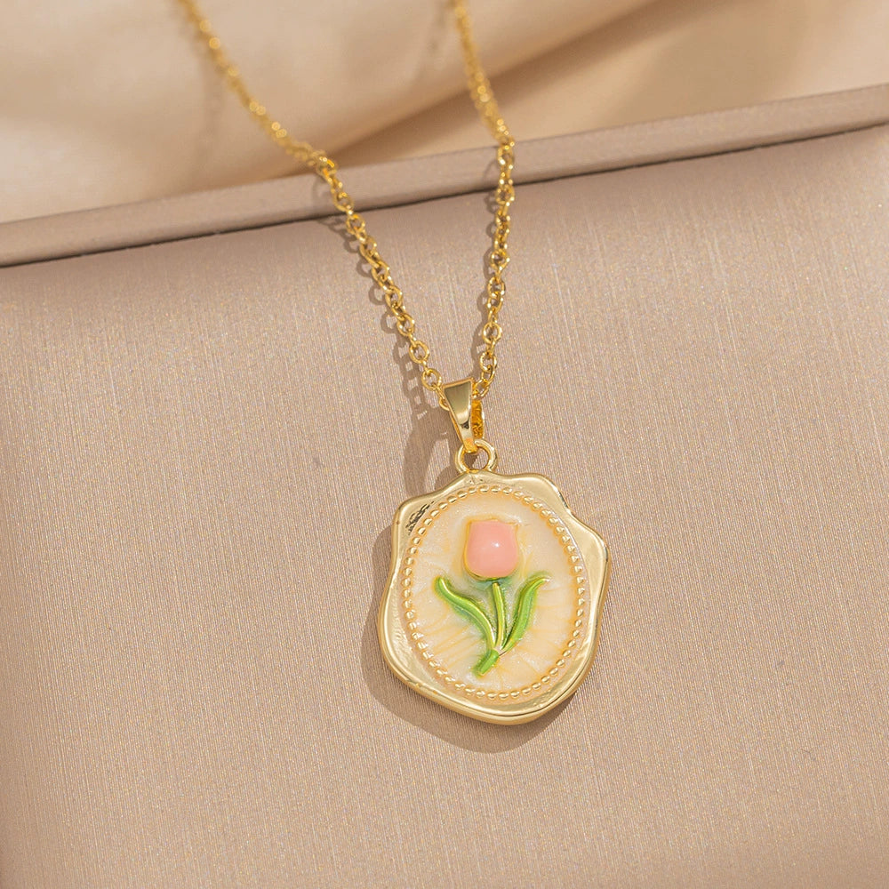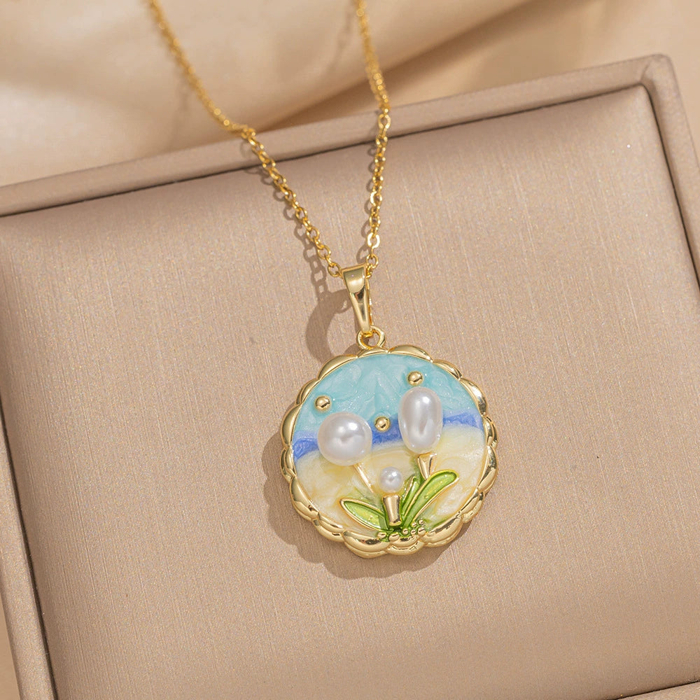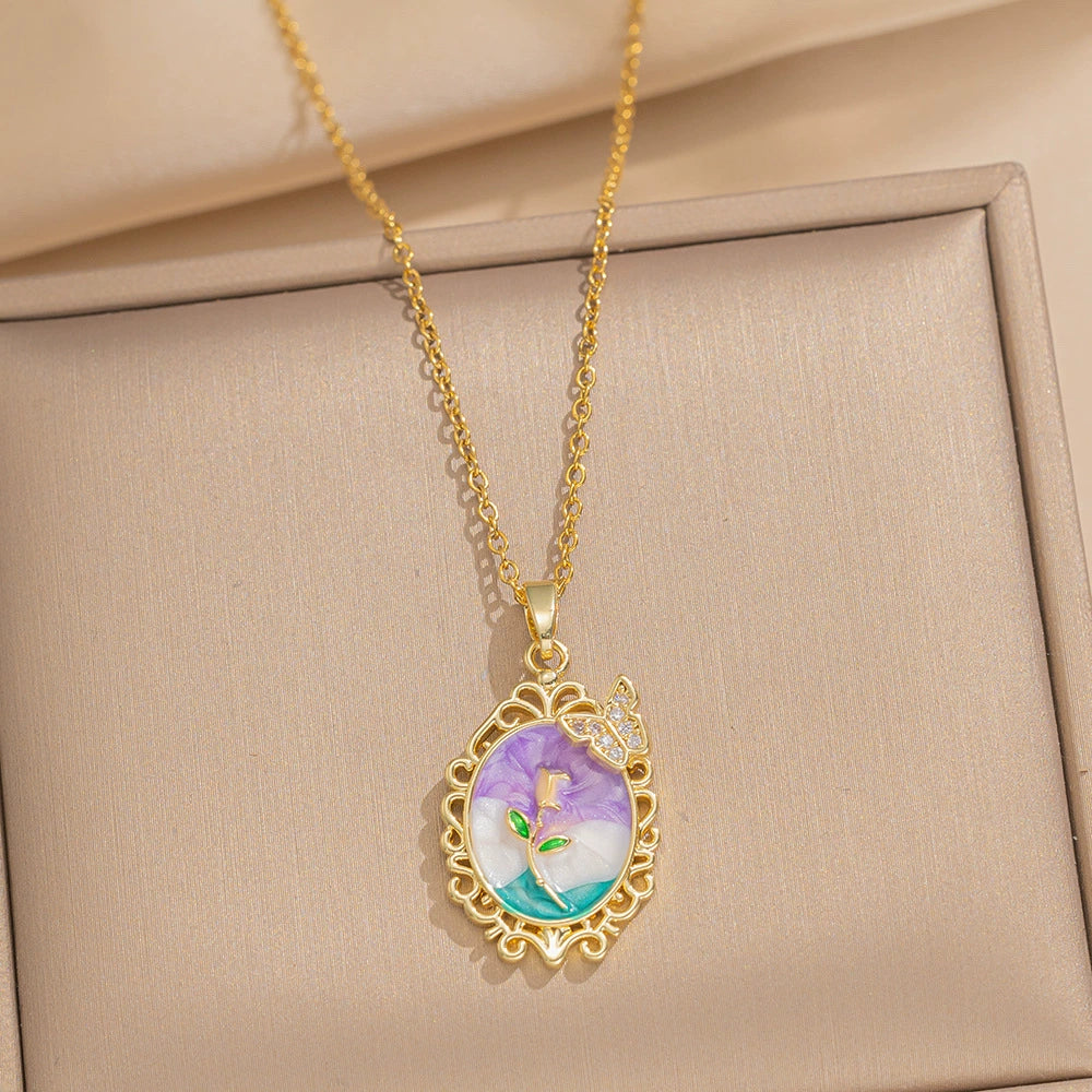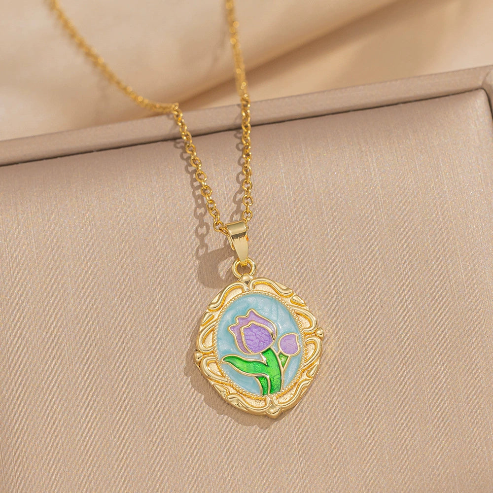 Women's Oil Painting Style Leaf Shaped Necklace Copper Titanium Steel Baroque Elegant Niche Light Luxury French Retro Allmatch Electroplated In Vacuum Furnace