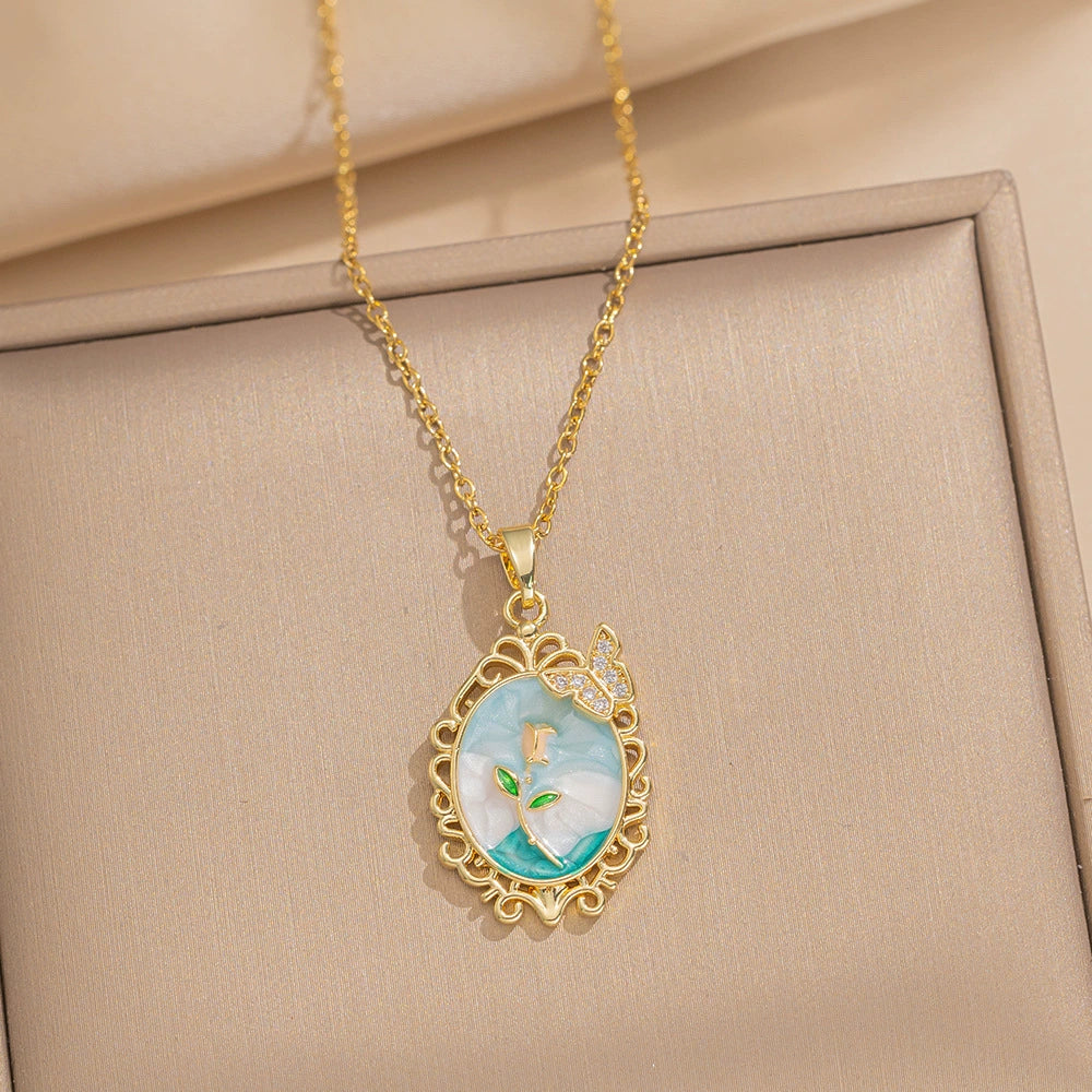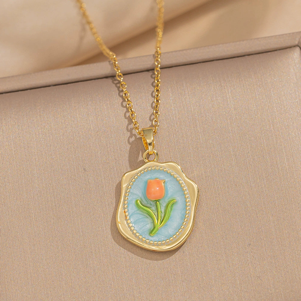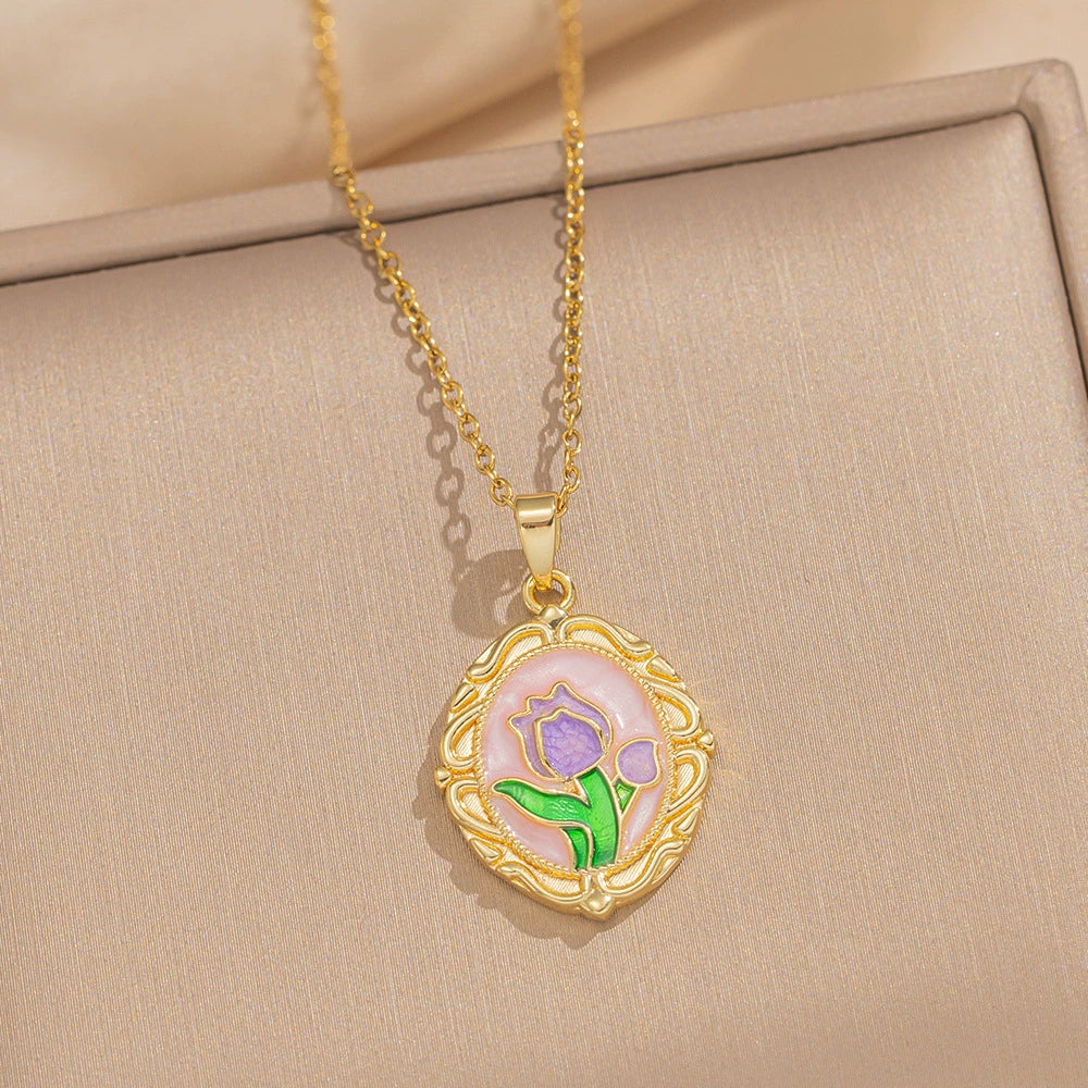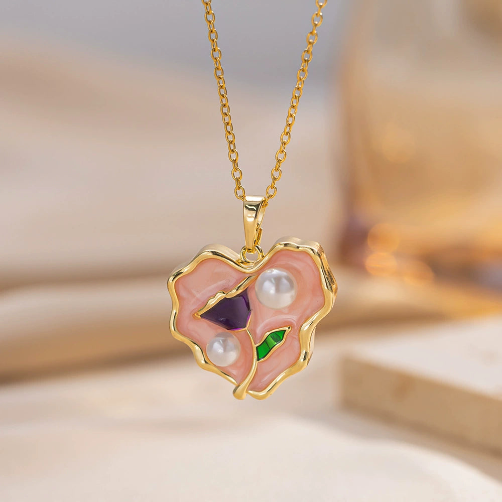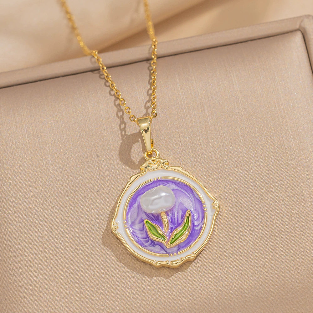 Women's Oil Painting Style Leaf Shaped Necklace Copper Titanium Steel Baroque Elegant Niche Light Luxury French Retro Allmatch Electroplated In Vacuum Furnace