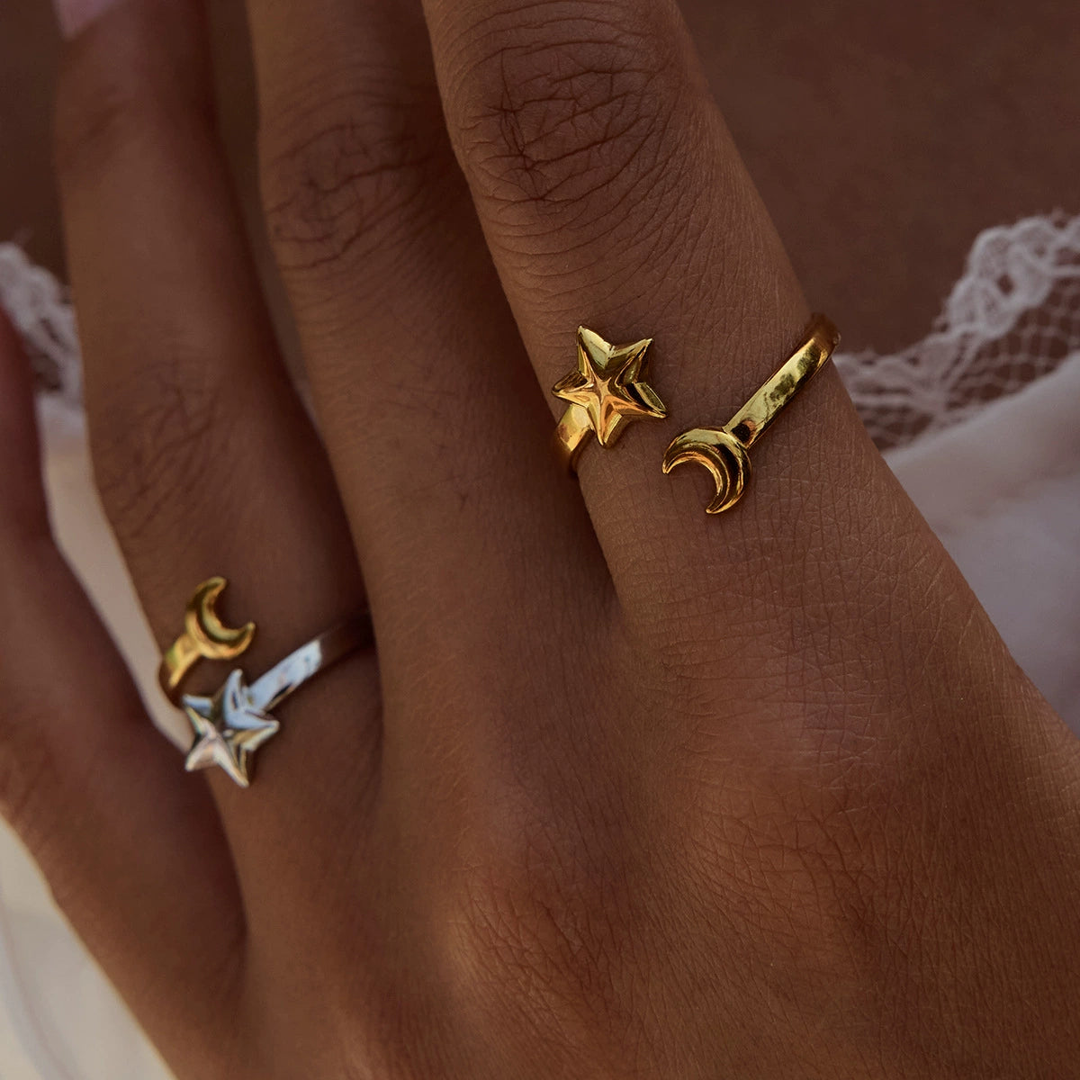 Women's Titanium Steel Open Ring With Geometric Star Moon Design And 18K Gold Electroplating