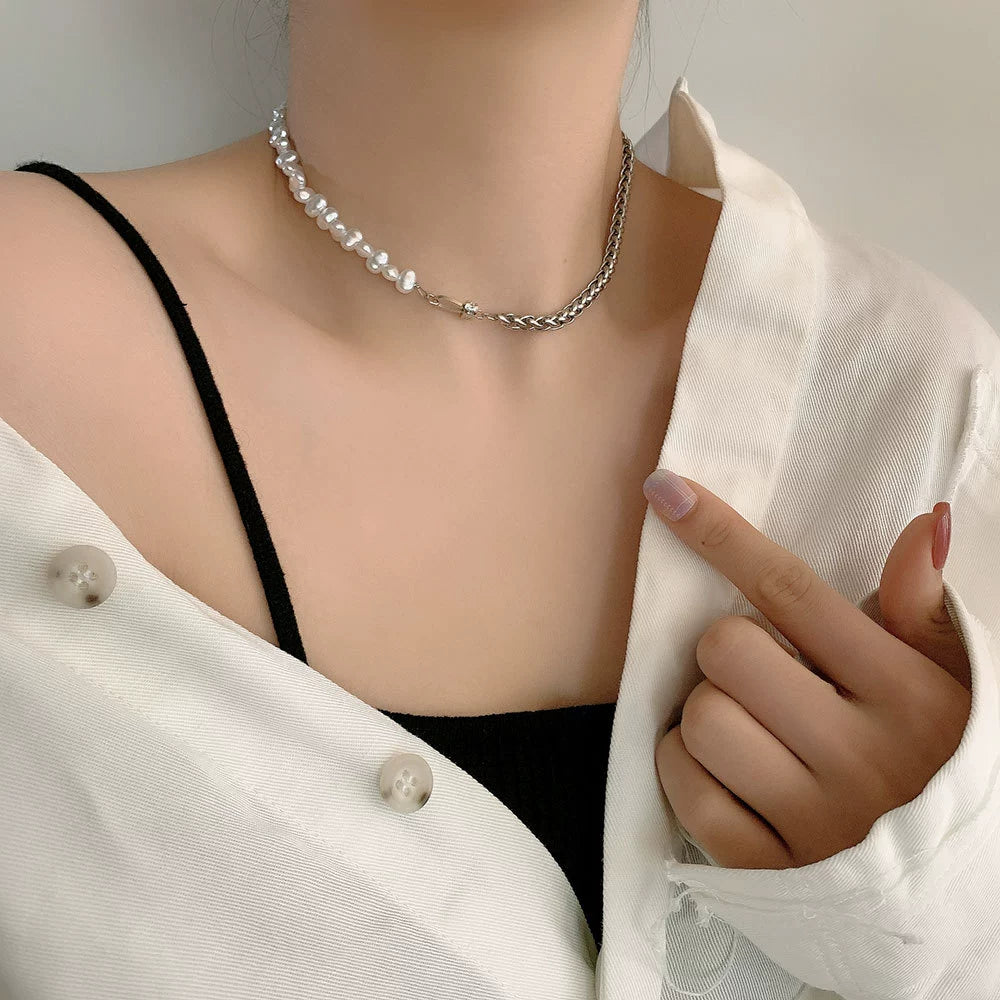 Women's Titanium Steel Stitching Design Specialshaped Baroque Pearl Necklace With Polishing Process And Bow Pattern