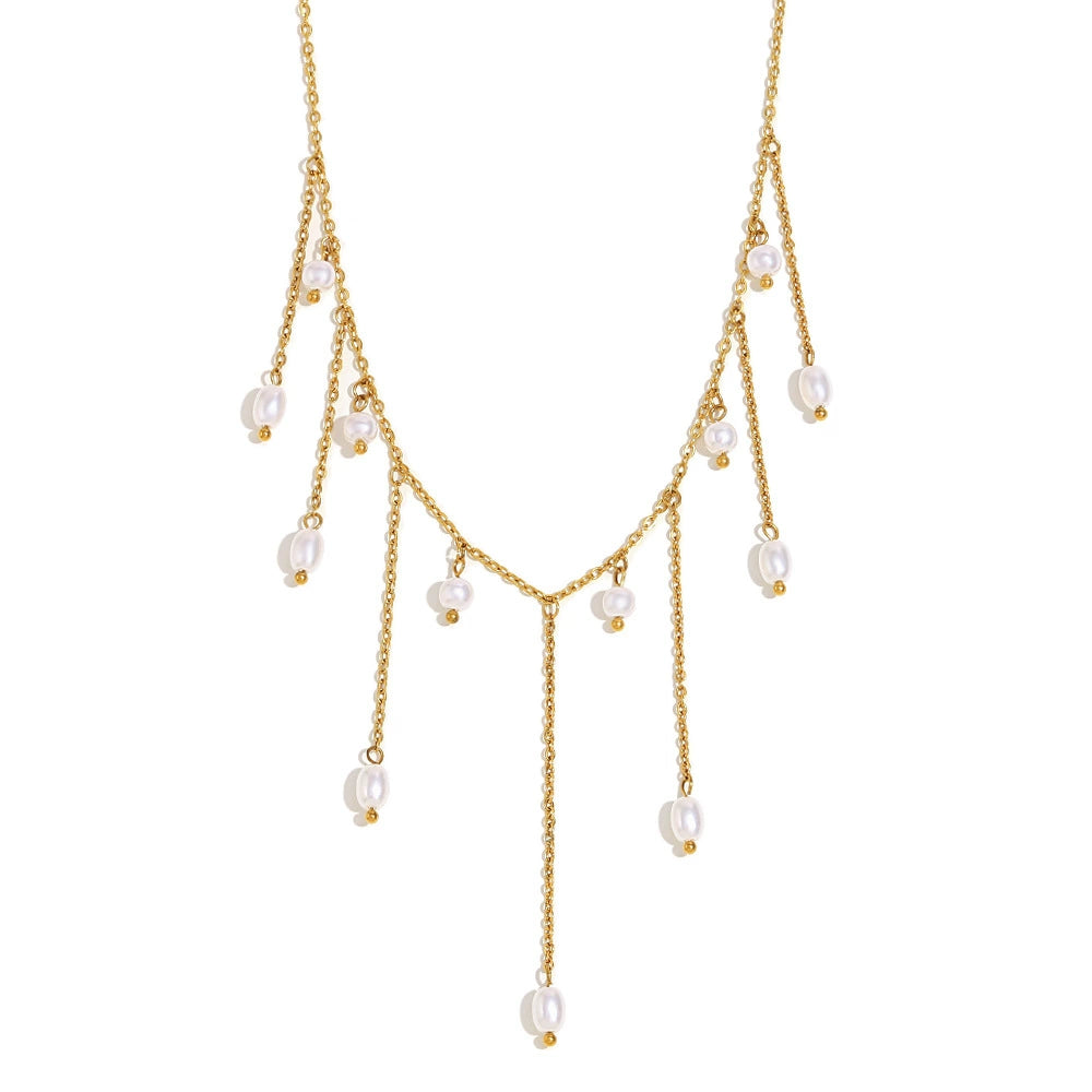 Fashion Temperament Antique Jewelry Stainless Steel Plated Imitation Pearl Tassel Necklace Geometric Shape Electroplated
