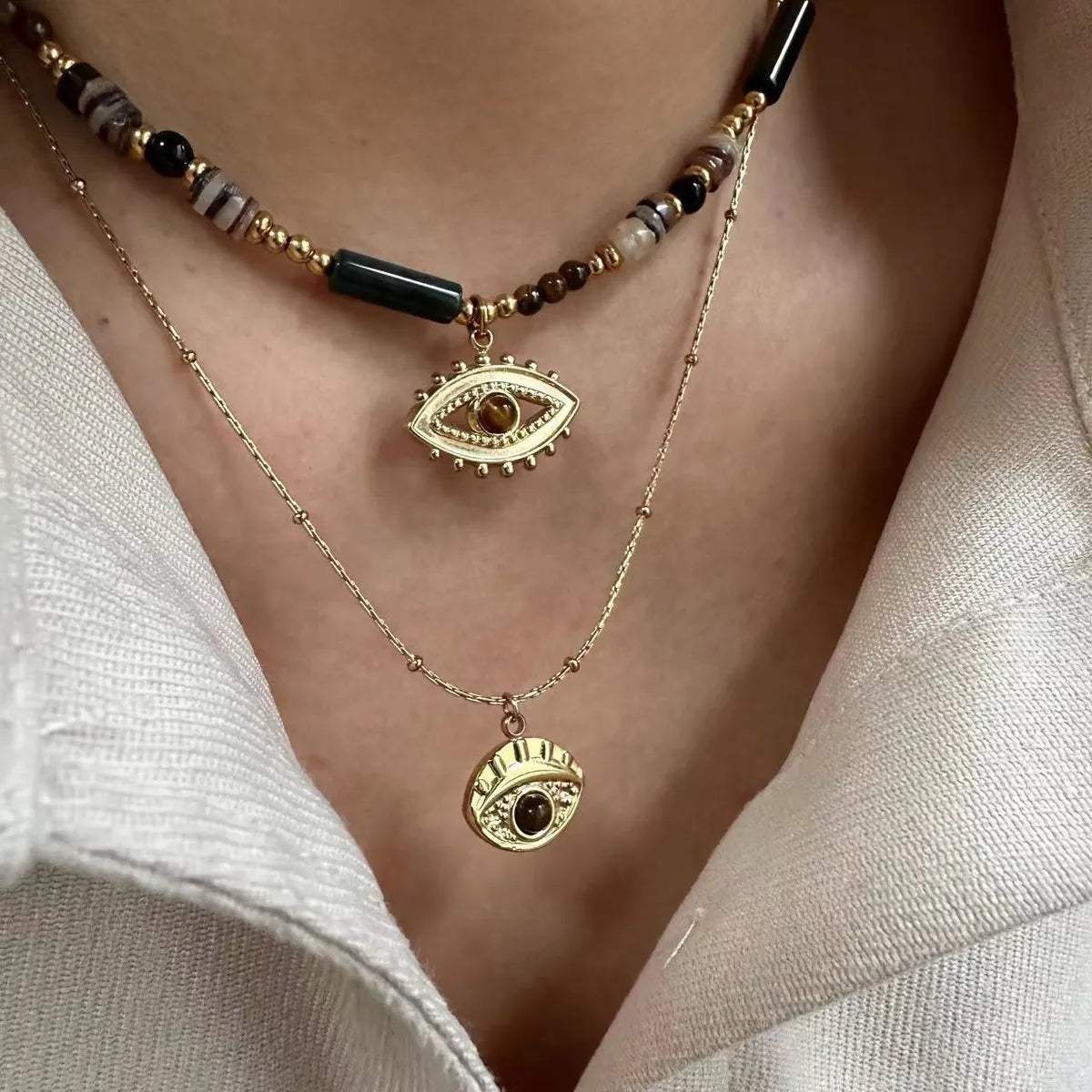 304 Stainless Steel Natural Stone Titanium Steel 14K Gold Plated Retro Ethnic Style Classic Style Plating Geometric Round Eye Rings Necklace