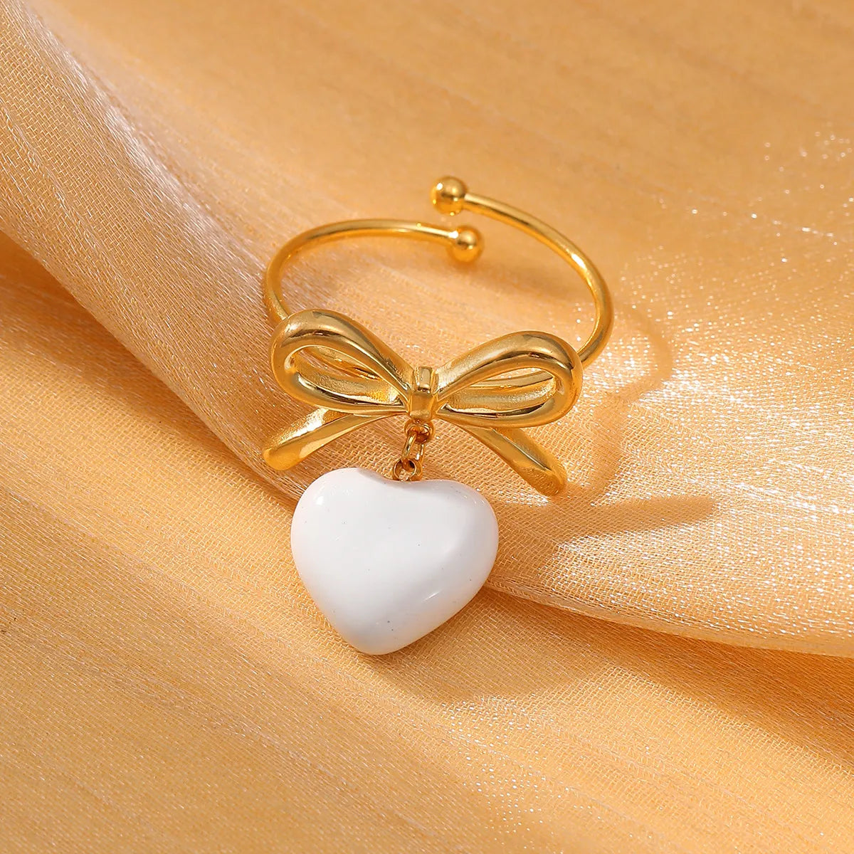 304 Stainless Steel Sweet Enamel Plating Heart Shape Bow Knot Charm Rings Open Rings