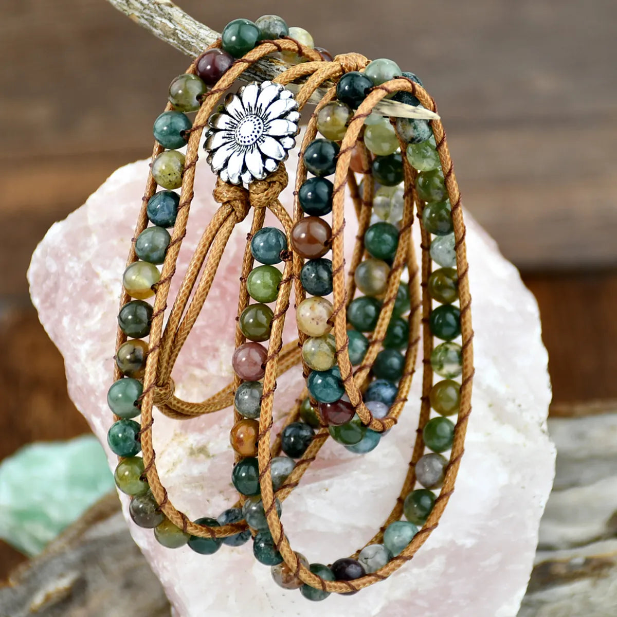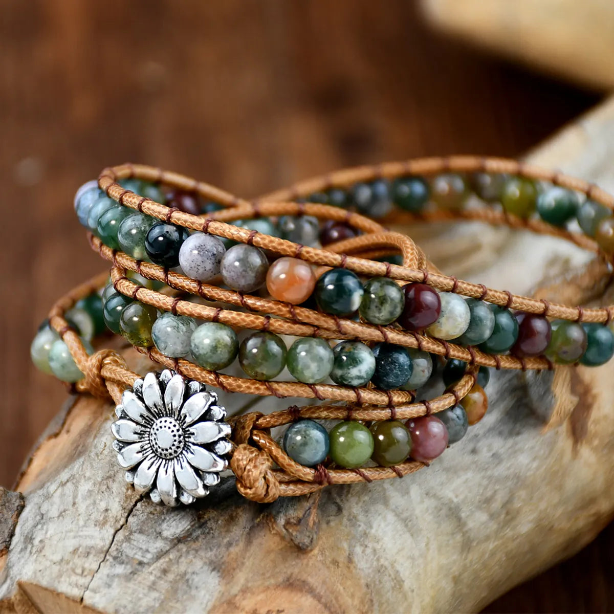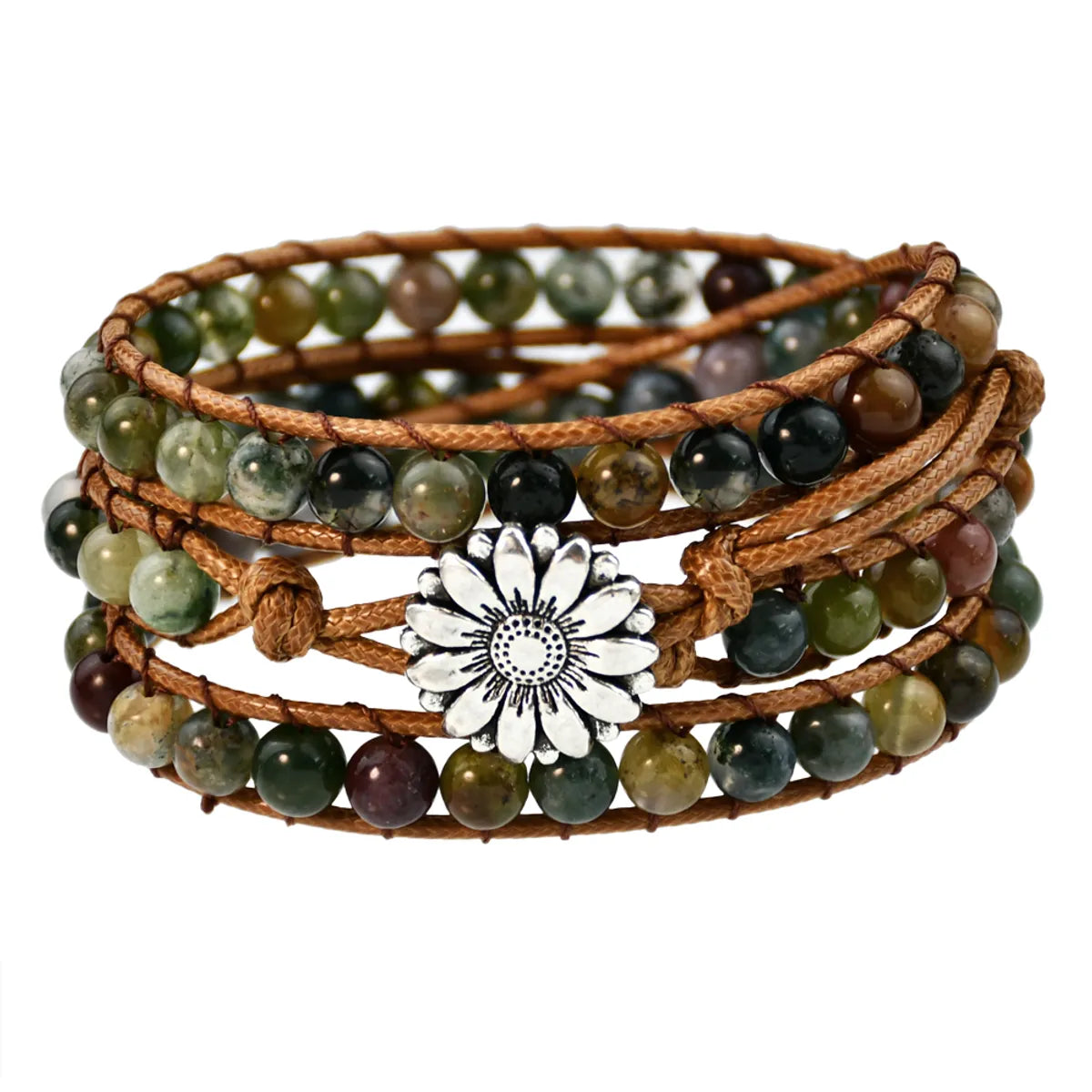 Classical Vintage Style Flower Alloy Natural Stone Rope Beaded Knitting Bracelets