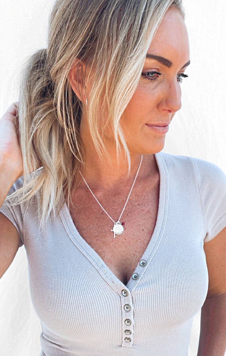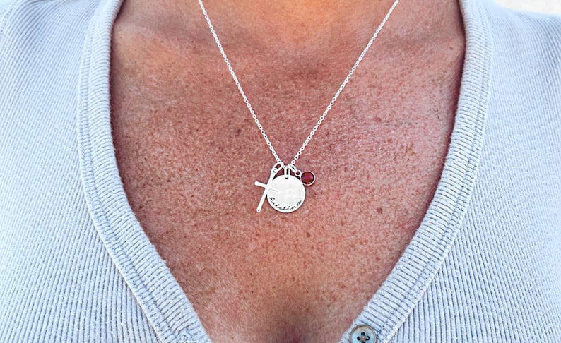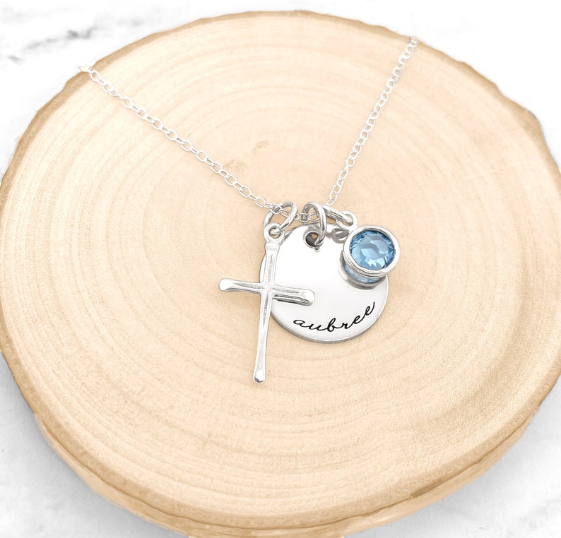 This necklace comes with a beautiful cross charm, dainty engraved disc, and birthstone of your choice are all strung delicately from a fine sterling silver chain.