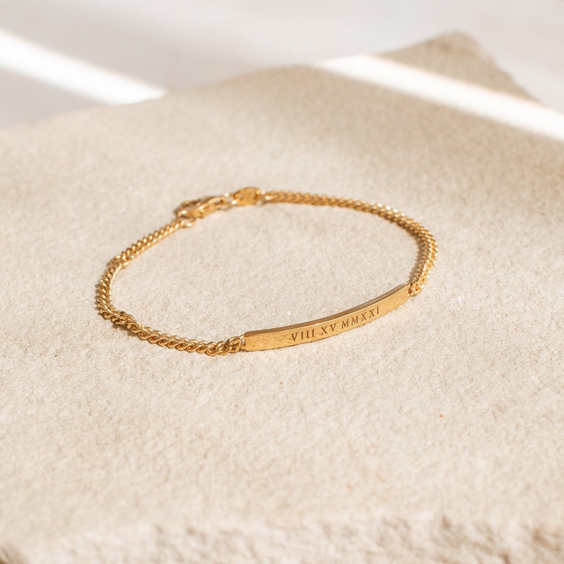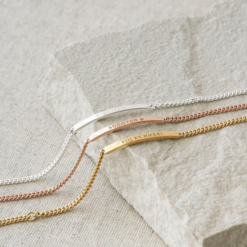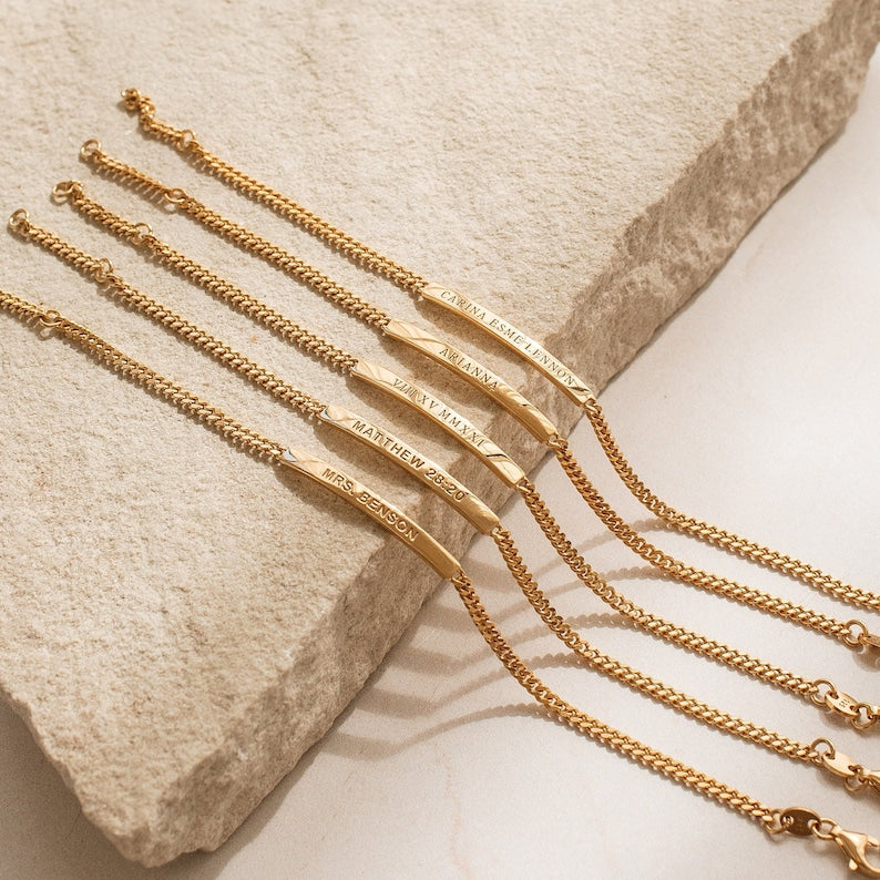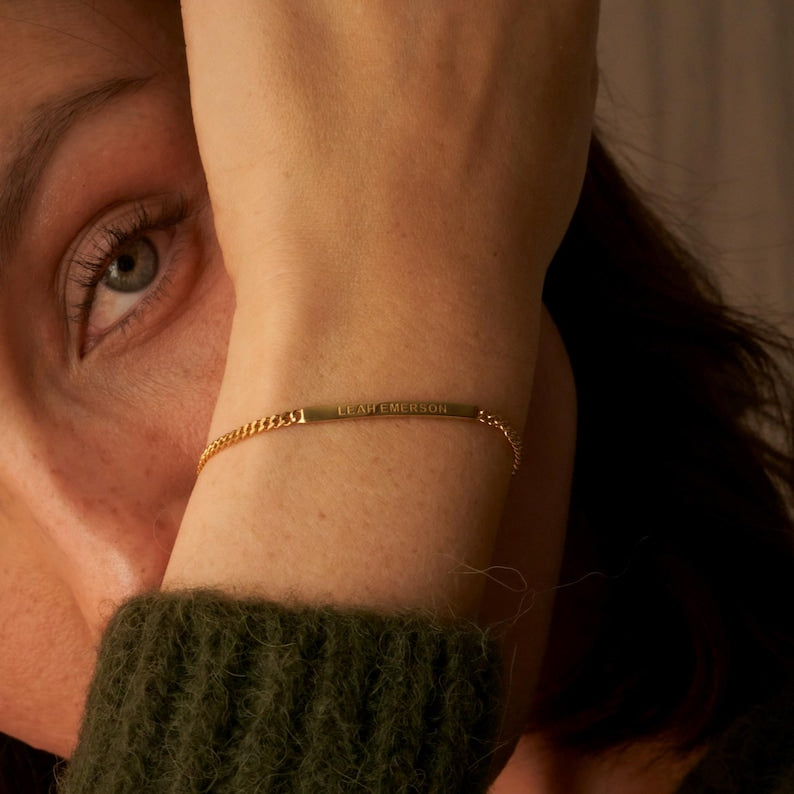 Our popular and sentimental Dana Bracelet features a bar nameplate, engraved with your name or the name of a loved one. The bold curb chain makes this perfect as a standalone piece or layered with your favorite bracelets. It’s a heartfelt gift for any occasion, from engagements and anniversaries, to birthdays or holiday gatherings. Our double-sided engraving option allows you to leave a sweet and simple message on the back of the bar for your loved one.