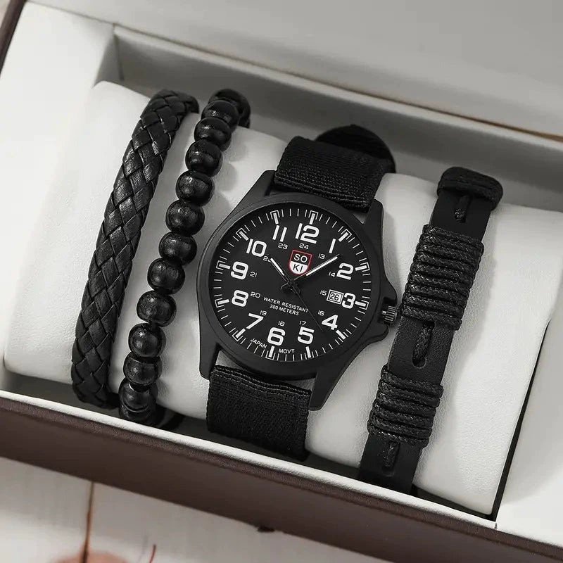 Men's Business Quartz Watch And Allmatch Beaded Bracelet Set Alloy Case Imitation Leather Strap Stainless Steel Clasp Round Dial Mineral Strengthened Mirror