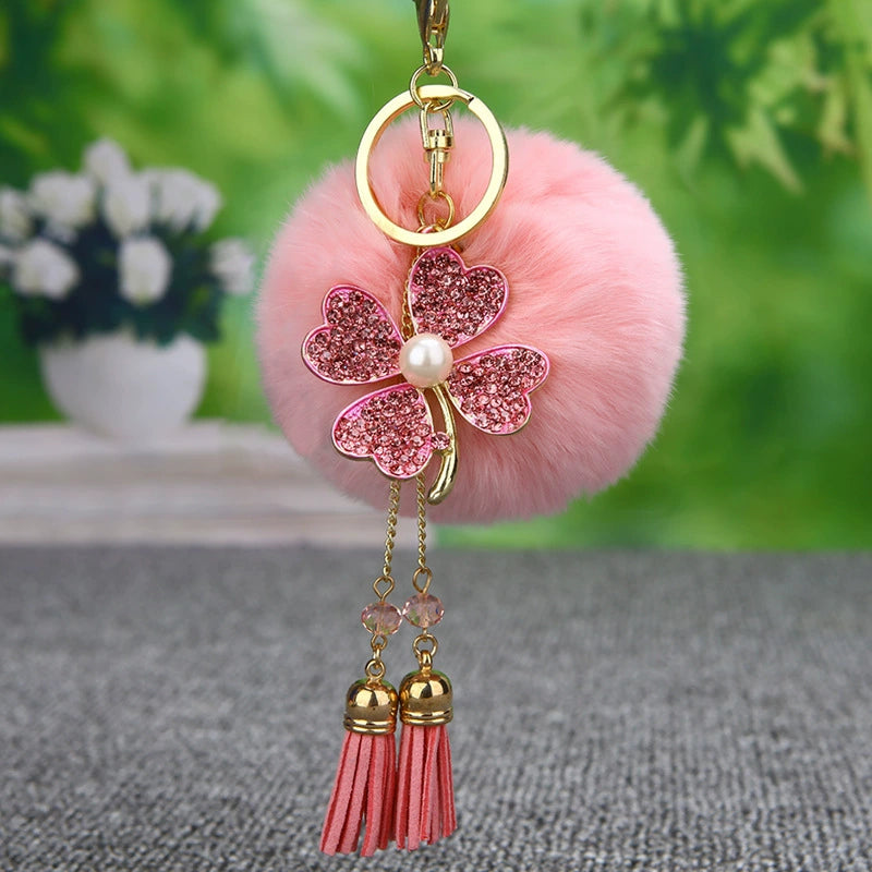 Metal Fourleaf Clover Car Key Chain And Velvet Bag Pendant For Women Suitable As Gifts
