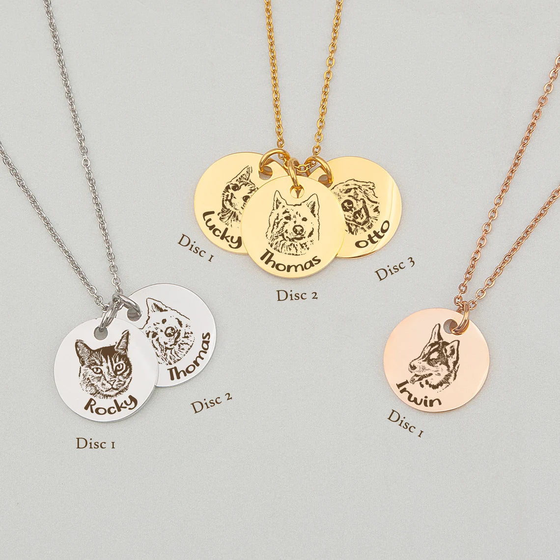 Our pet portrait necklace makes an exquisite gift for pet lovers. It showcases a detailed image of your beloved pet, accompanied by their name engraved below. With its intricate and eye-catching design, it's perfect for daily wear. Since each necklace is crafted to your specifications, it carries a personal touch that makes it truly one-of-a-kind and meaningful to you.