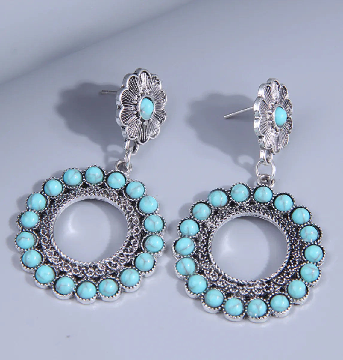 Retro Round Alloy Splicing Hollow Out Turquoise Drop Earrings 1 Pair