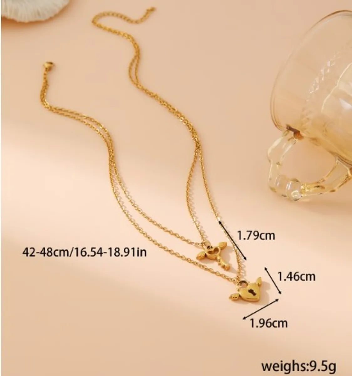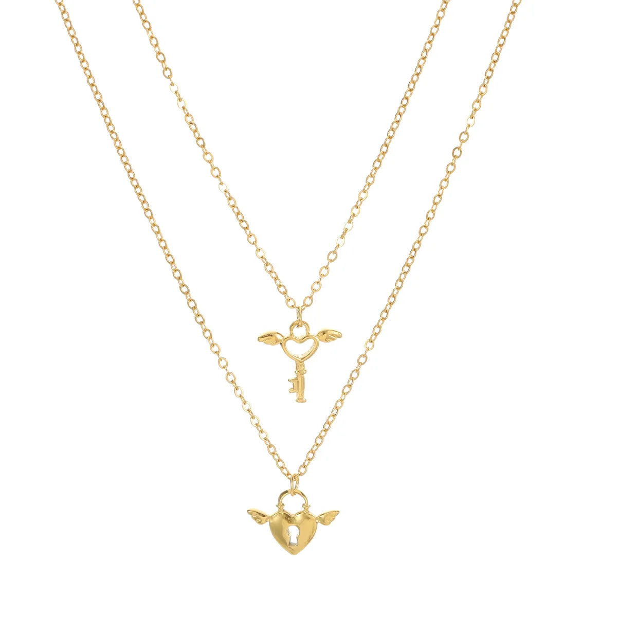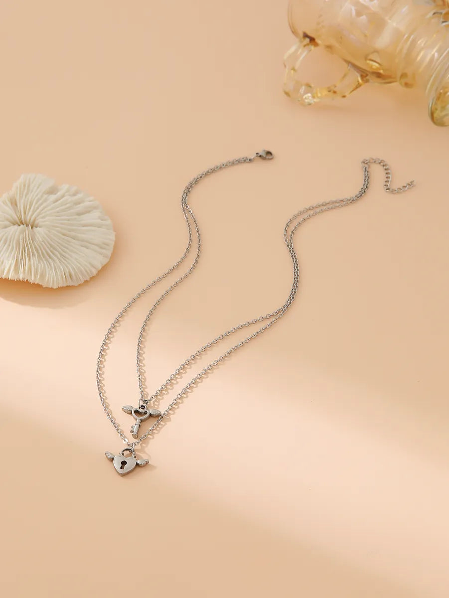 Wholesale Jewelry Casual Vintage Style Artistic Wings Key Lock 304 Stainless Steel 18K Gold Plated Hollow Out Double Layer Necklaces