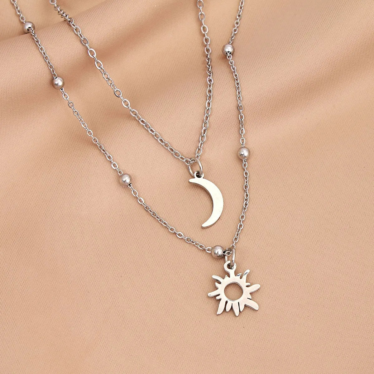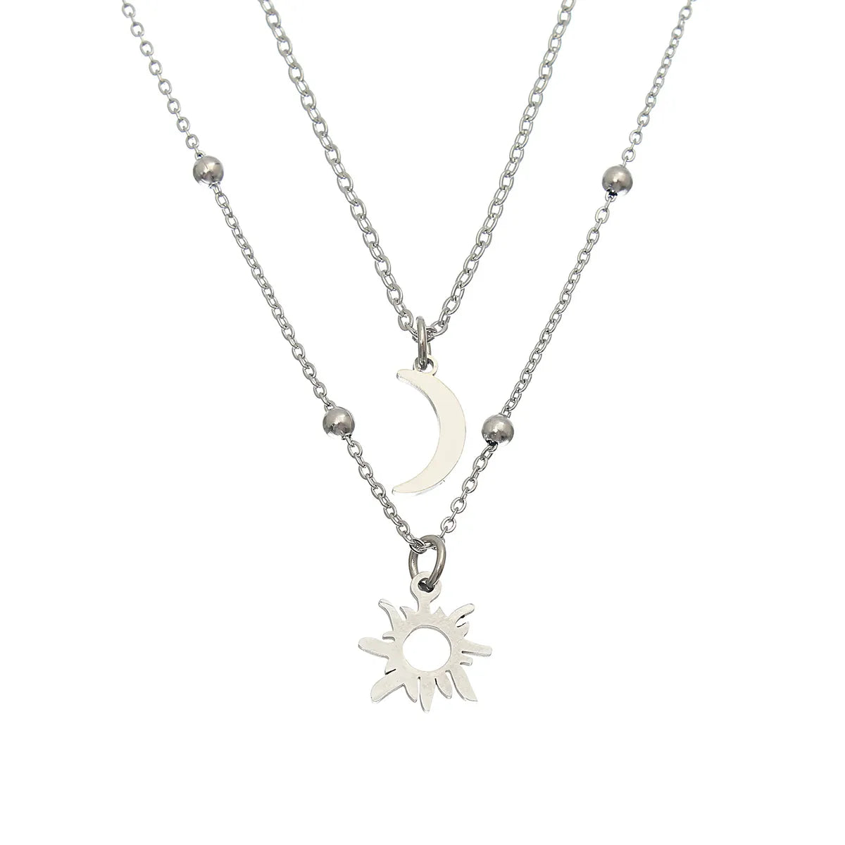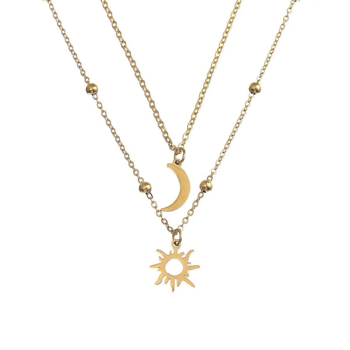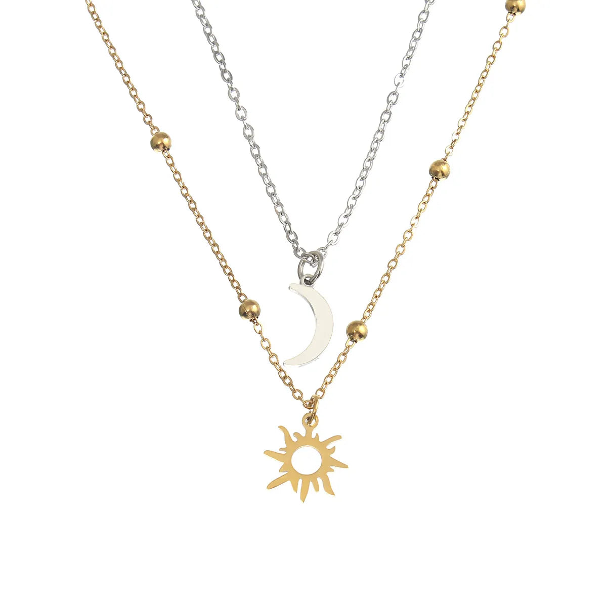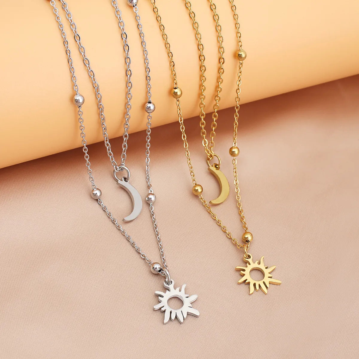 Wholesale Jewelry Simple Style Sun Moon 304 Stainless Steel 18K Gold Plated Double Layer Necklaces