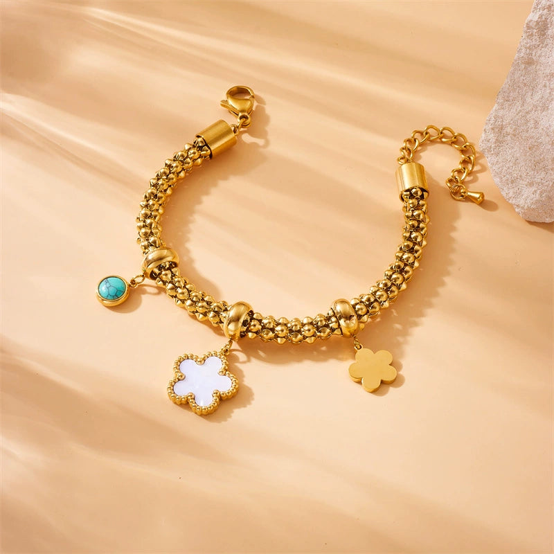 Wholesale Stainless Steel Fashion Retro Gold Plated Flower Moon Star Turquoise Accessories Pendant Chain Bracelet For Women