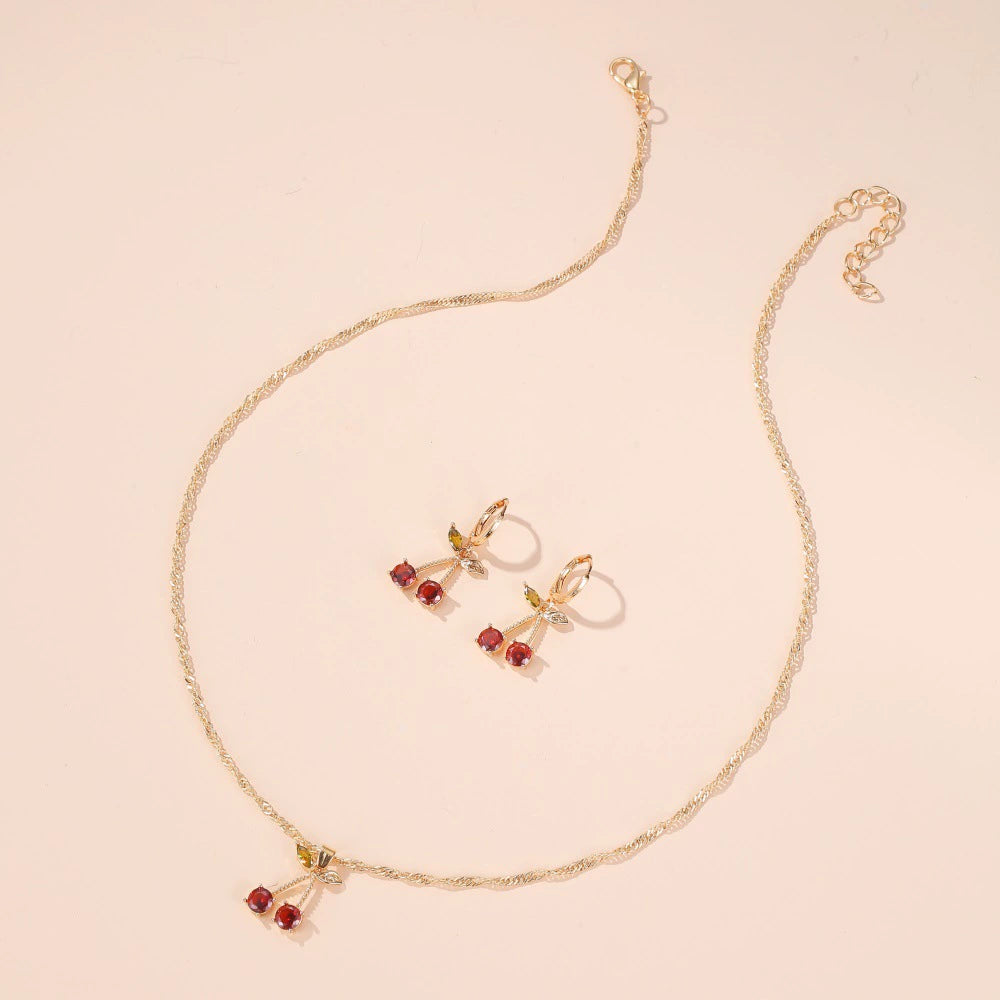 Wholesale Women's Cherry Pattern Copper Electroplated Glass Pendant Stranded Chain Necklace And Earrings Set
