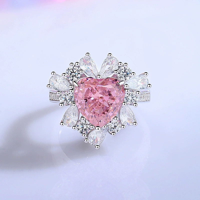 Wholesale Women's Light Luxury Heartshaped 925 Sterling Silver Pink High Carbon Diamond Ring With Ice Flower Cut
