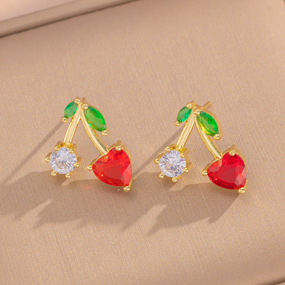 Women's Heart Cherry Necklace Set With Mixed Gemstone Setting And Titanium Steel O Word Chain Set With Diamonds Light Luxury Niche Style Electroplated In Vacuum Furnace